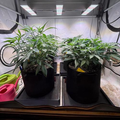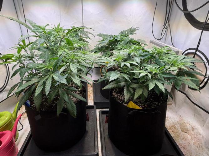 Die Ladys habe sich nach dem Transplant und Topping Schock erholt und starten endlich ein kräftiges Wachstum. Was der genaue Grund war sie einige Tage auszubremsen zu sagen wäre zu spekulativ aber vermute eine kombination mehrerer Faktoren wie (etwas zu trocken umgetopft) (20% Perlite anstatt wie gewohnt nur 10% aber dennoch wie bei 10% mit 2,5 Litern angegossen was möglicherweise ein wenig zu viel war) (das Topping während dieser stressphase also 2 Tage nach transplant).