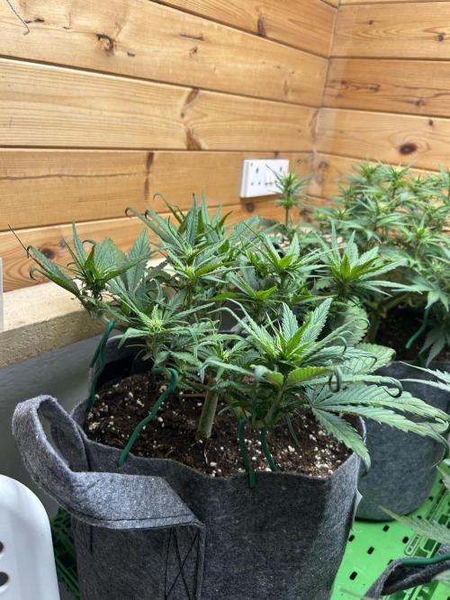 jdean88 A lot of lst this week so plants looking a bit twisted from the amount of training the claw is slowly going away now on the og found ti be very sensitive to nutrients but she has riveted and starting to out grow the rest they are now showing signs of preflower coming so iam praying for a big stretch..the gorilla melon is now in the tent ready to be vegged big enough to fill the full tent will transplant soon into a bigger pot