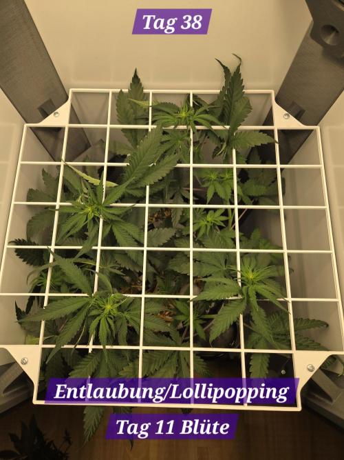 Tag 11 Blüte: Lollipopping der unteren kleinen Triebe und ebenfalls habe ich die unteren Fächerblätter entfernt.