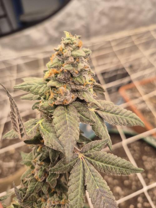 The GMO. Wow, it still smells like pure SWEET GAS and ROTTEN MEAT lol. Its a weird combo but it smells horrible in the best way. It still has another few weeks to go and continues to pack on more weight. The colas are super heavy and could probably benefit from a 3rd trellis. I can't wait to compare my Triple Burger clone to this!