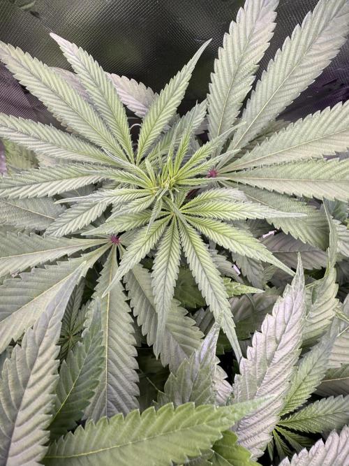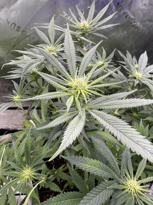 FarmerRasa Buds clustering in way more now. The plant has stretched decently and I am taking steps to keep her happy, healthy, and watered enough to produce thick, heavy bud sites. 1 of 4 plants in this tent and has a section of the tent where the branches have been spread out to fill in her section of the tent. Did a bit more defoliation since the center was just a mess of fan leaves that were not necessary at all. Now the light can penetrate some of the lower bud sites a bit better, hopefully.
