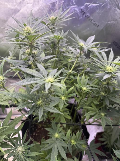 FarmerRasa buds sites are starting to cluster and grow in. Loving how things are turning out. some good smells coming from the plant. a small defoliation was done to keep airflow good since I have 4 big plants stuffed in this tent. Can't wait for this to finish out.