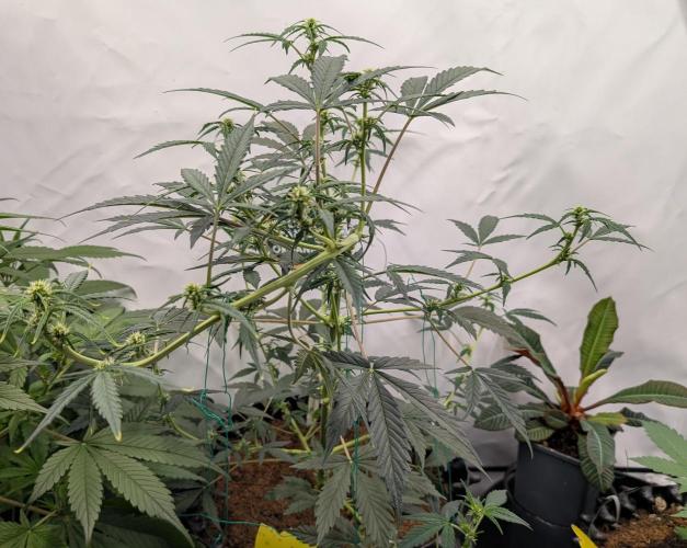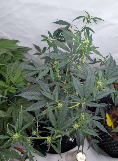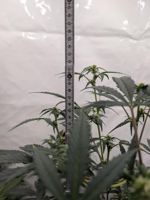Anyway, this plant is shooting up so fast, like I've never seen before. It looks very sativa-esque. And as you can probably see, the tips of the top leaves have some burn damage. I've raised the lamp to prevent that. Flowering has begun, and I'm very excited to see how this turns out.