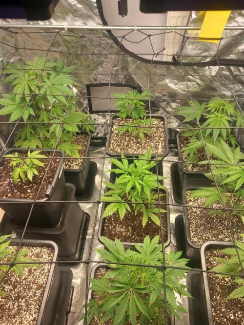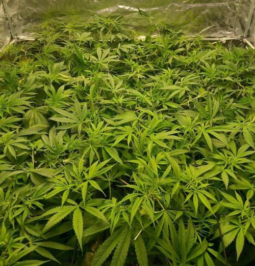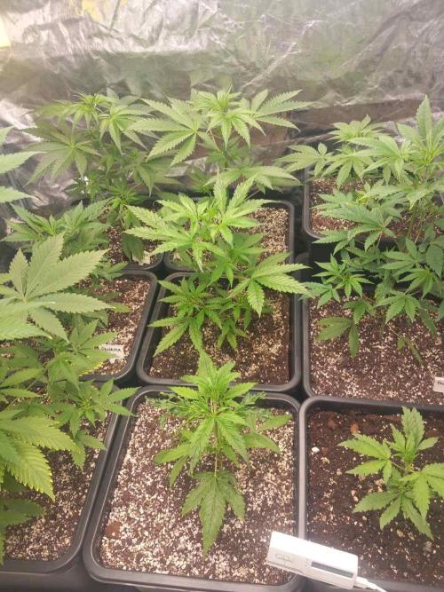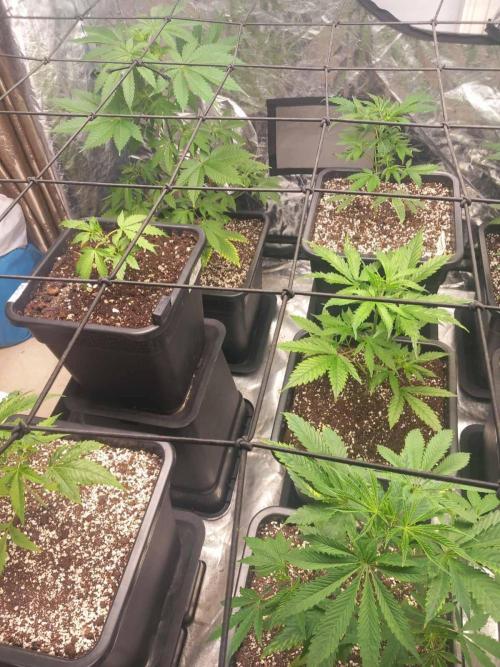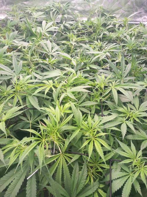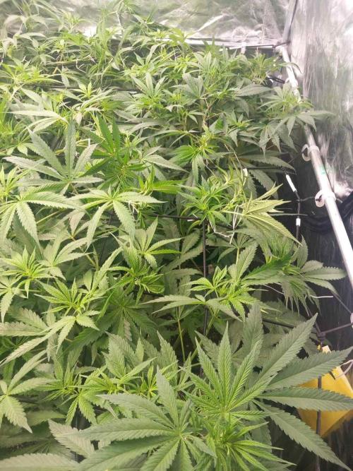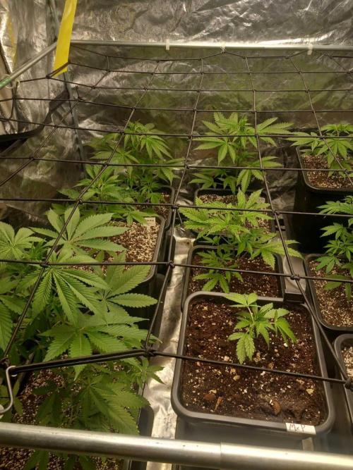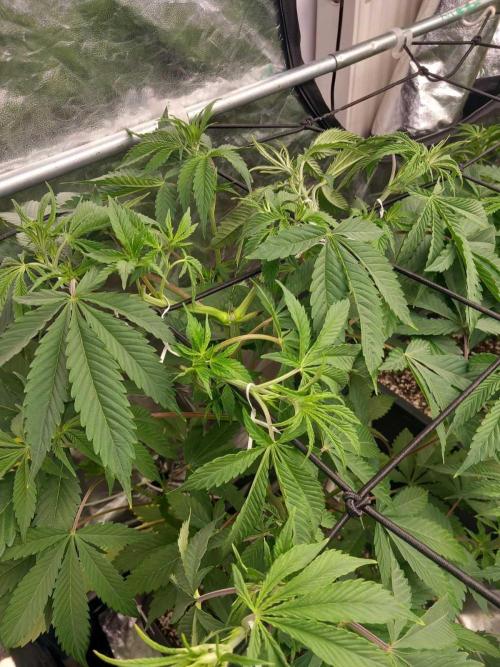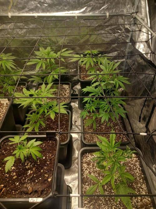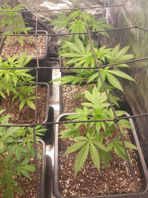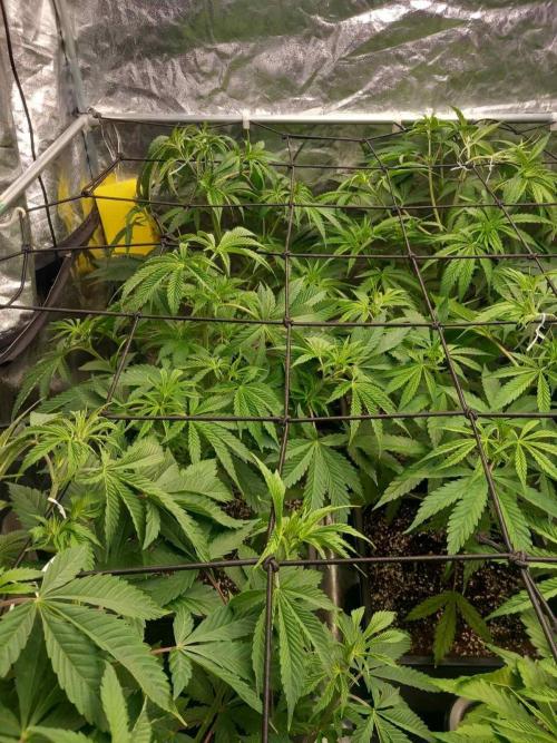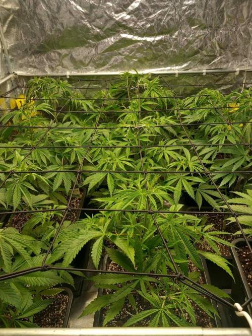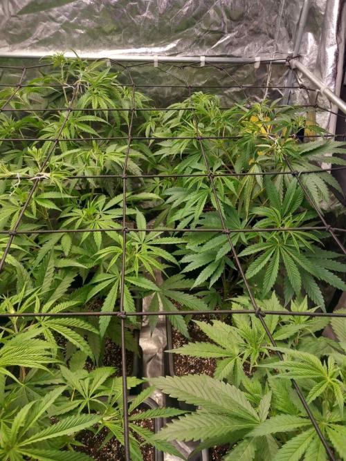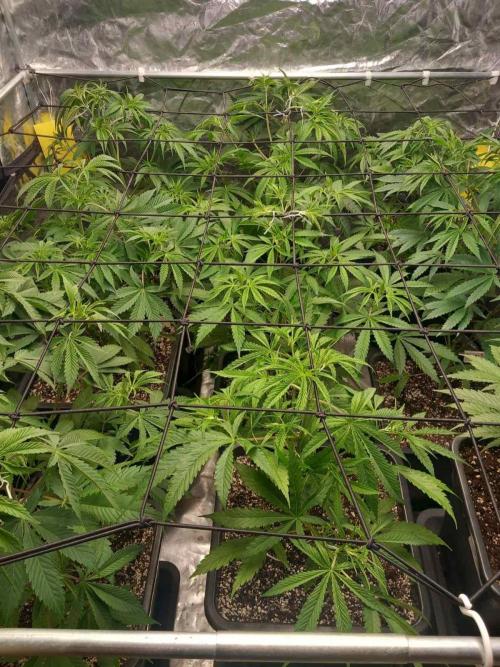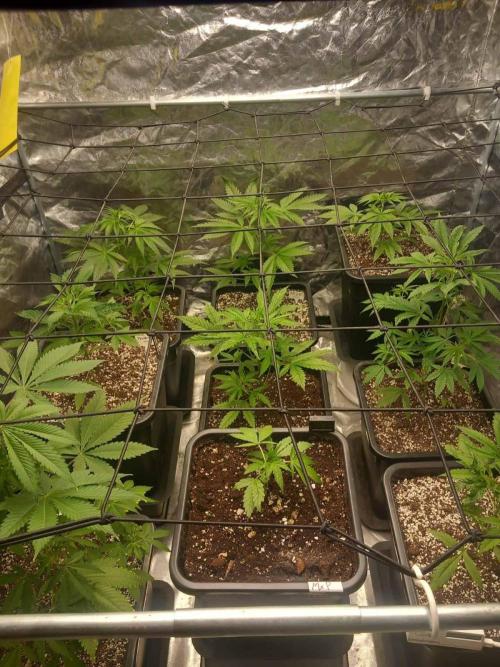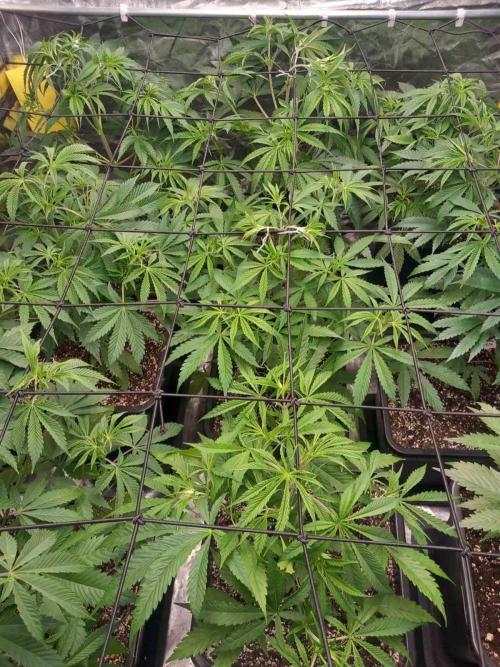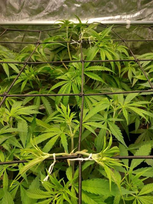 Xipsiomega1 Day 42 from sprout, end of week 6. I will give these beauties 30 hours of darkness and after will flip to 11/13 light schedule for flowering. Before switch to flower i will spray them with 100% bio K salts to prevent pests. Topped some this week. Seven plants are topped and two are not now. Tied some stems to the net, and i will keep doing this for two weeks till all the net be a screen of geen foul of colas.
