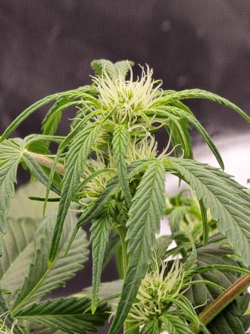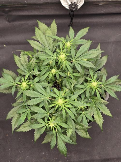 She’s officially transitioning into flower this week, with pistils showing across her bud sites. Growth is looking solid, and she’s adapting well to the switch into bloom.