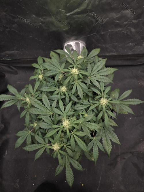 She’s officially transitioning into flower this week, with pistils showing across her bud sites. Growth is looking solid, and she’s adapting well to the switch into bloom.