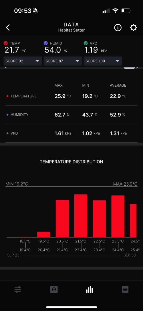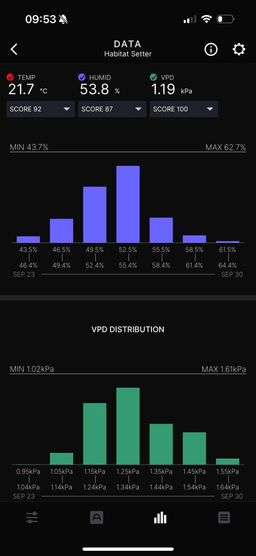 Humidity is fluctuating between 52-58%. Temp is 22-26 Celsius. VPD is relatively constant around 1.30 except for very rainy days where my dehumidifier gets info play.
