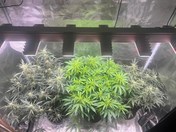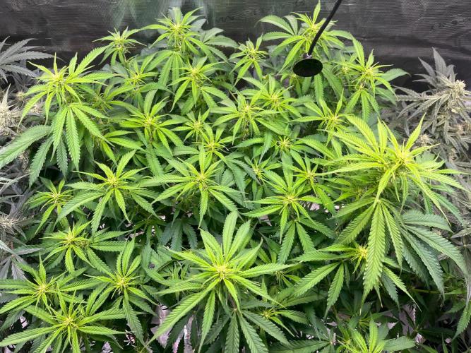 LocalCelebrity She gets 5 liters every second day and is stretching like crazy. I have to constantly defoliate her she grows bushy like a hippie in the 70´s. Last defoliation was a big one and now air can go through. Giving her about 950 ppfd for 18 hours now. Still a little bright for my taste and i ramped up the nitrogen already.... All in all she grows like a behemoth so i dont worry that much about the colour but in contrast to the other ones next to it i cant help to be bothered haha.