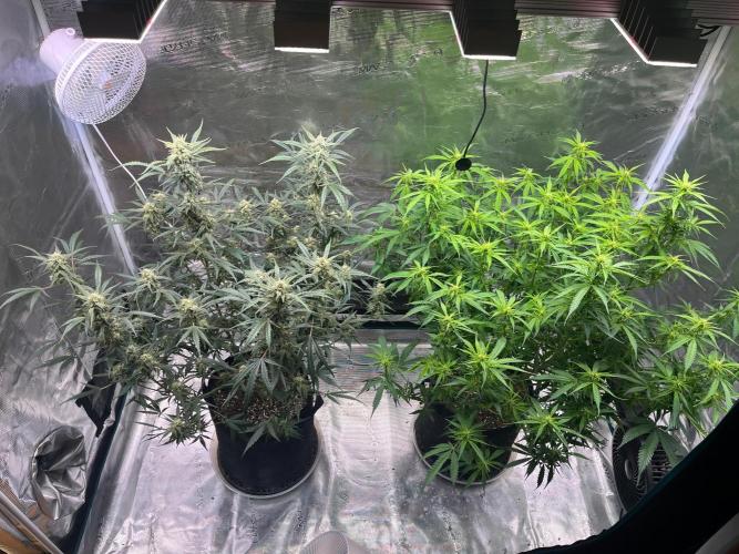LocalCelebrity I dont know whats going on but she is a monster haha. I will defoliate a little bit again in a few days. She is dwarfing the Zup next to her which is a respectable plant on its own but the Glowberry thinks its outside or something. I give her 6 liters every 32ish by now.
