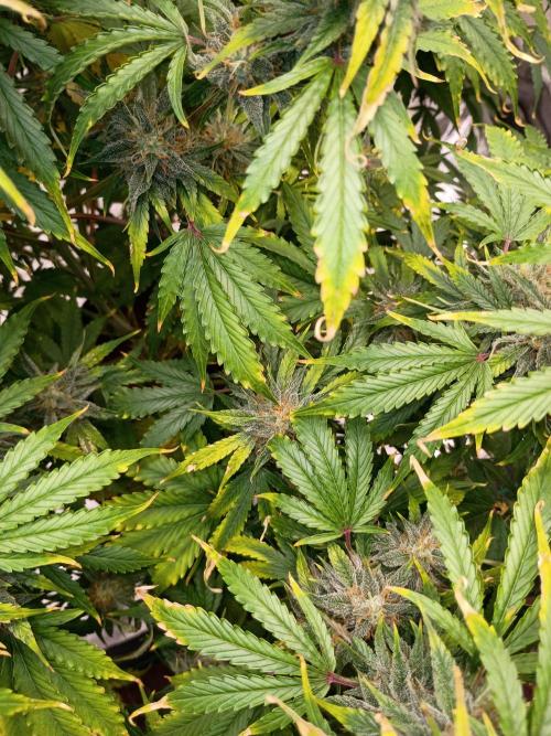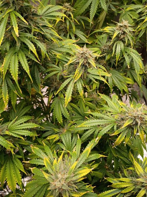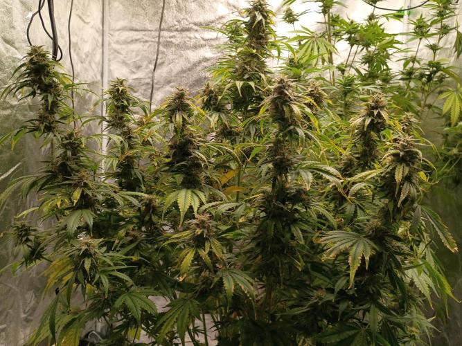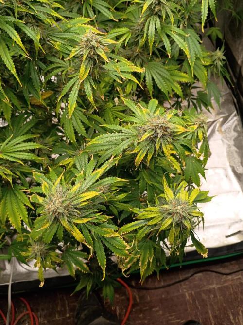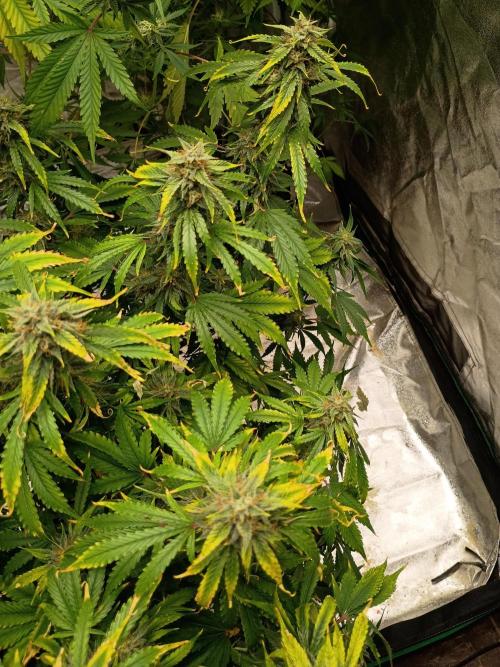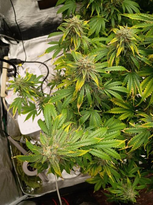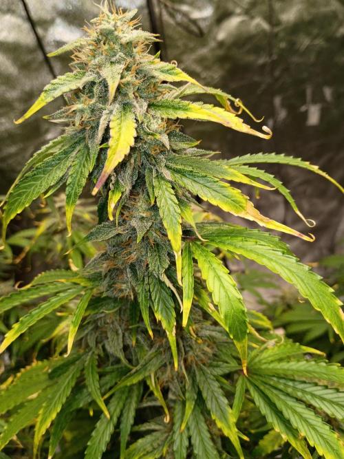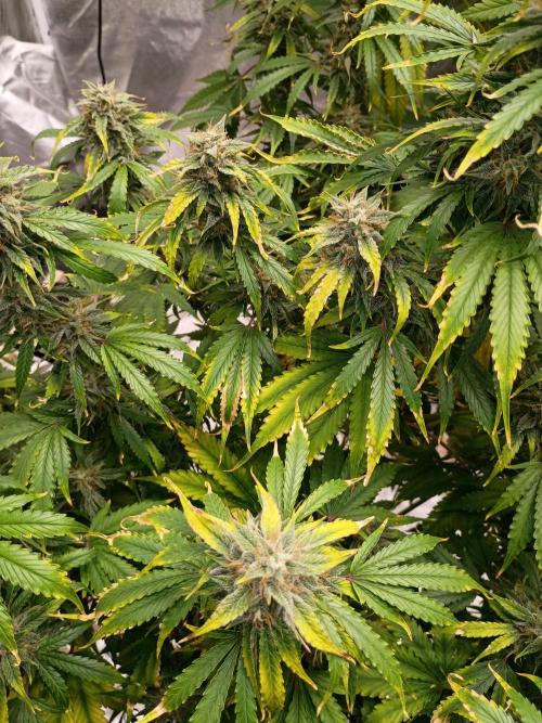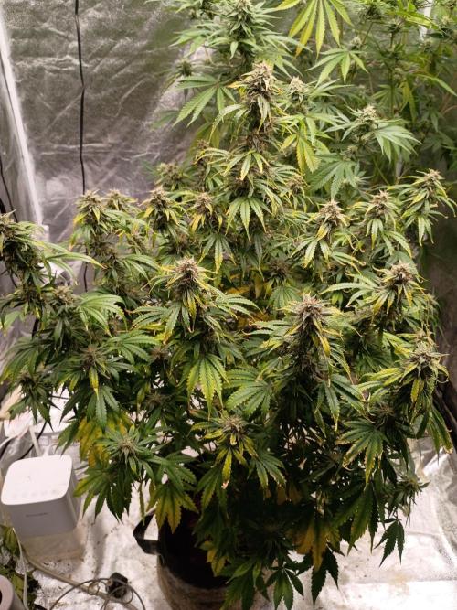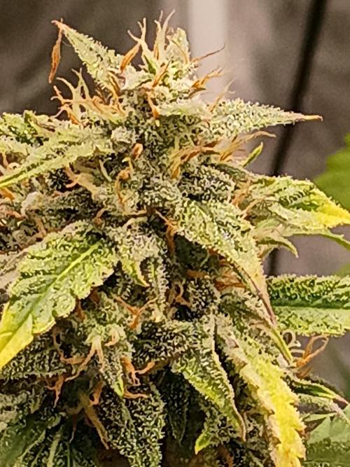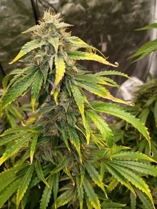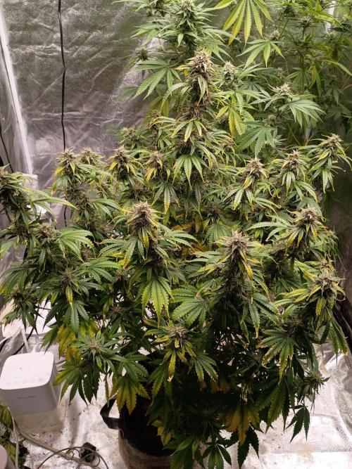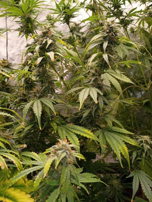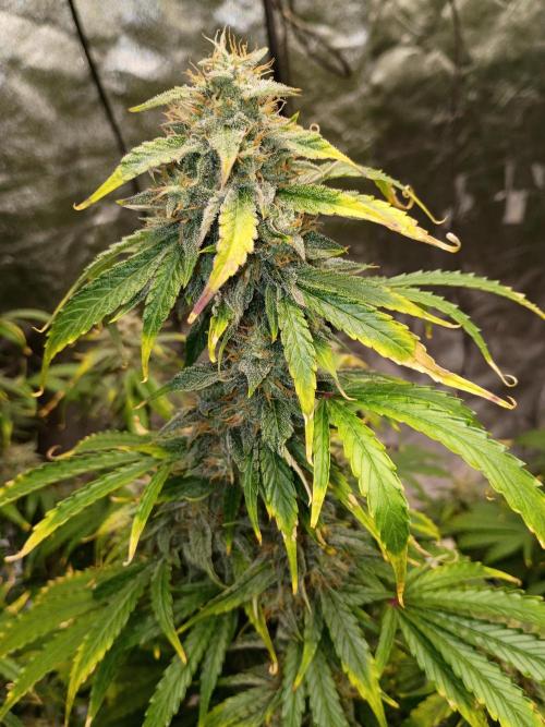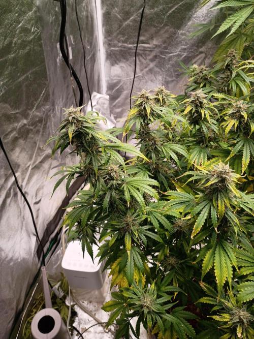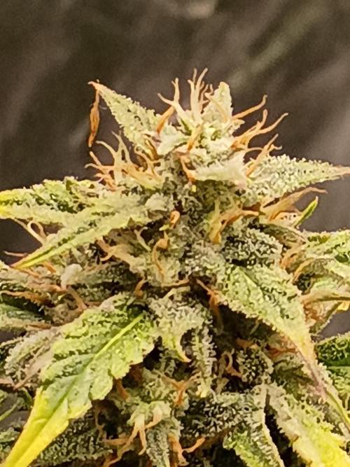 Mrdub Ain't this girl gourgous and she reeks of sweet funky gas loud AF and getting louder pistols turning darker and darker and starting to curl so looks like harvest should be in a week the trichomes on this girl are very heavy looks a glitter bomb exploded on her buds starting to swell stalk and stems are sturdy holding up the fat buds with no problem she is on time growing like a champ has a gourgous 30x30 canopy so here's to another week of growing this absolutely perfect girl