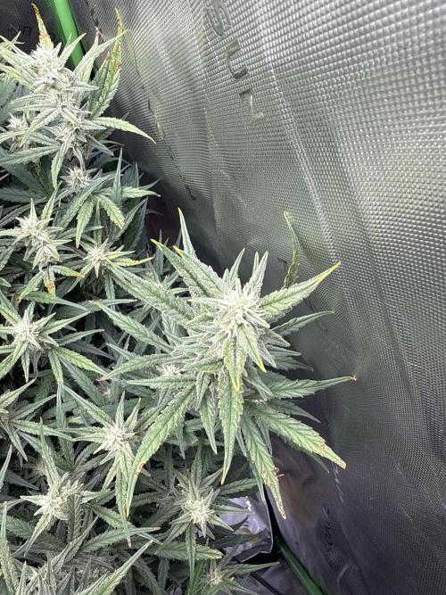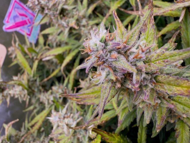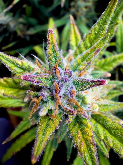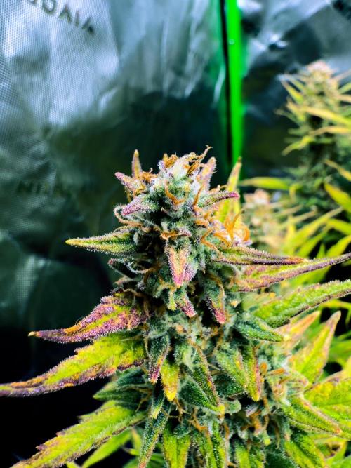 Hangman905 Leaves are starting to get the purple fade. Lower buds are extremely frosty. Starting to really bulk up
