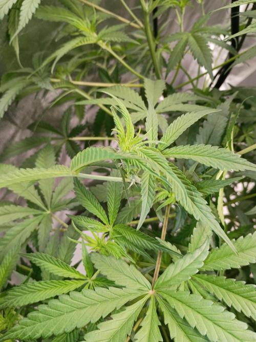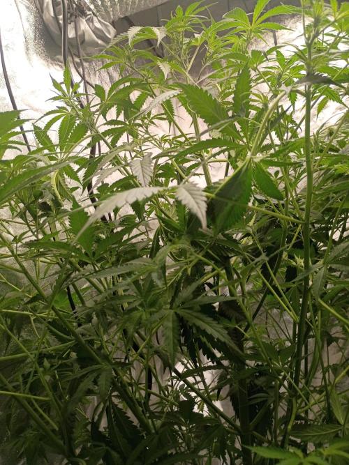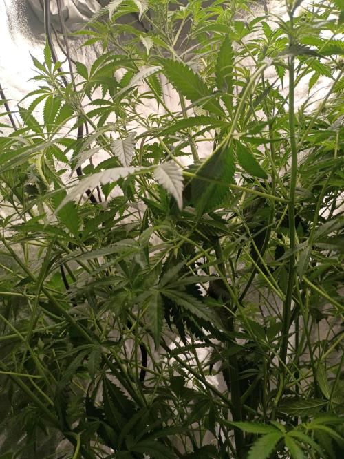 Mrdub This girl is taking her time finally opened her bud sights pistols starting to form but the stems are pretty weak lots of veg prob due to strive nutes I have mixed feelings about them to much nitrogen not much smell this one is def gonna be Christmas tree it's gonna take so long she does has a nice stretch with 32x32 canopy