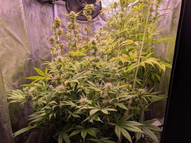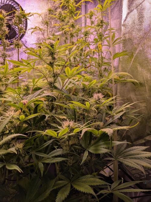 Volodymyr Кусты зацвели.За неделю 2 куста из 3 вытянулись аж на 30 см. Один куст почти не прибавил в росте, он на переднем плане фото и видео. Те что выросли- приобрели фруктово-цитрусовый аромат, и у них черешки листьев стали краснеть. Чтож, моего гроубокса явно мало для трёх растений. В будущем попробую автоцветы на балконе посадить, интересно как они там себя покажут.