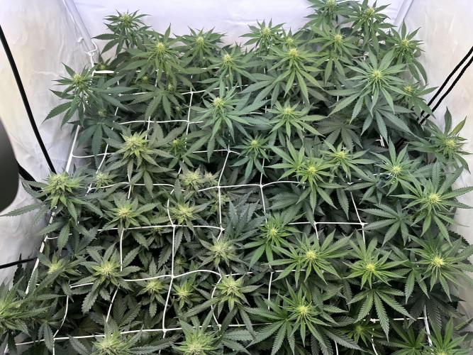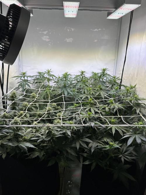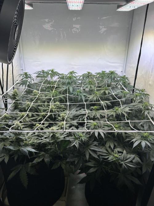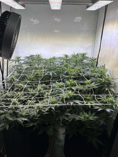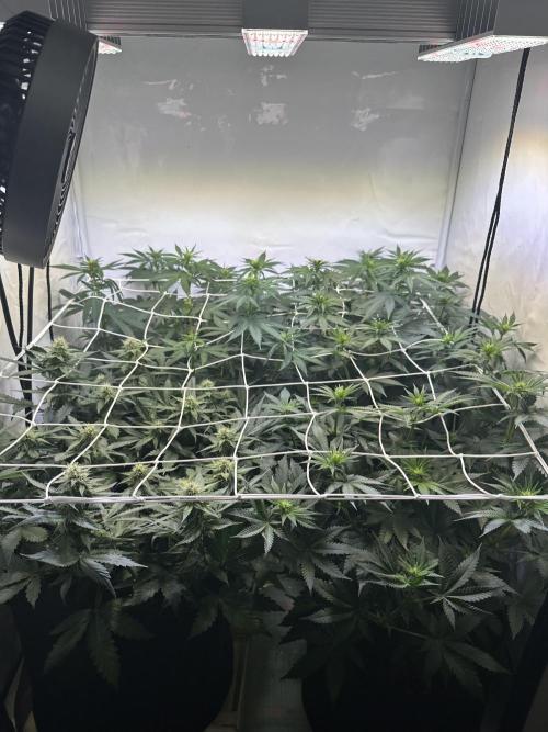 Very minor defoliation of dead leaves, I also bought a scrog net but I’m asking myself if I should even use it, the top is flat enough and spread nicely. I count at least 10 nice main tops per plant, last grow I had about 4 per plant, I‘m really happy with the results so far:)