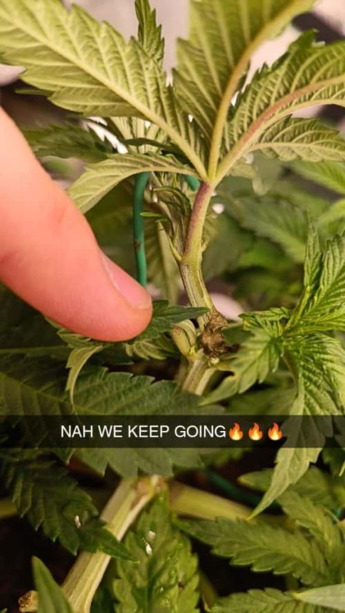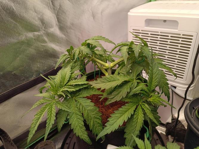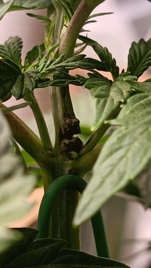 Oh yeah one of the two upmost branches on Purple Punch broke slightly when i LST'd it. I immediately stopped and since it was hanging on by just a lil chunk, put some of this amazing tree balm on and hoped it would reconnect. The next day i saw it was still alive, but not fully connected. It was already barely staying upright so i guess the balm mustve not done much to connect the two halves. But apparently doesnt matter if ur hanging on by a thread because that branch just recovered. Another day later, today, i could even LST the branch to point to the side instead of upward (since that wouldve been hell later on with one branch being tall AF). I made sure i wasnt putting a lot or any stress on the broken branch, but just slightly bending the furthest part so it can grow to the side again. i put more balm on it just in case but im sure that mf will pull through.