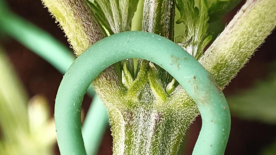 I ended up going around the cups circumference once, then hooking the end to the rest. Then next step is to set some kind of resistance near the bottom of the stem, so when u bend the top part down, the rest of the plant doesnt bend with, and you get a nice curve along a 90° angle.