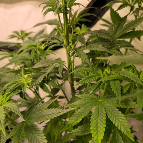 Nun ist es an der Zeit, das Licht umzustellen und damit in die nächste Phase zu starten. Außerdem werden ein paar der größeren Blätter entfernt, um den unteren Trieben mehr Licht und Luft zu verschaffen. So bekommen auch die tieferliegenden Bereiche bessere Entwicklungsbedingungen für ein gleichmäßiges Wachstum.