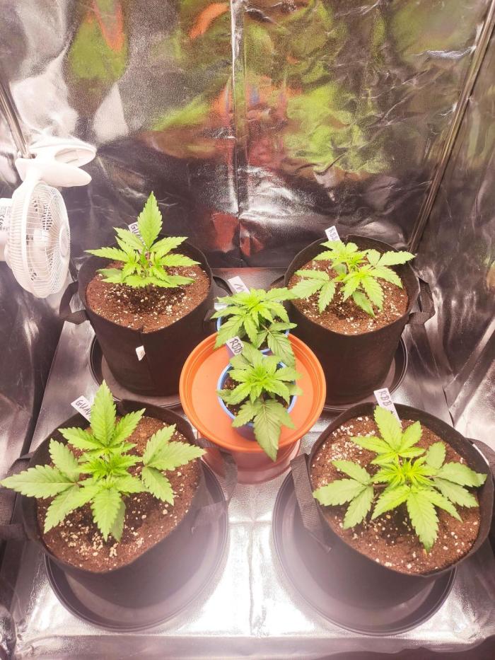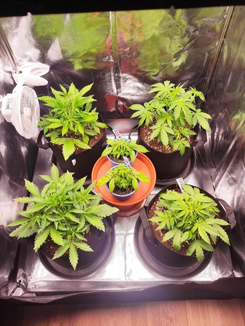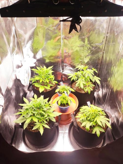 Moon636 Increased the water slowly to about 1 liter and added a bit more nutritions. I cut of some of the bigger fanleafs that covered up some of the smaller branches. The plant in the top right showed some Magnesium defecit but bounced back quiet well.