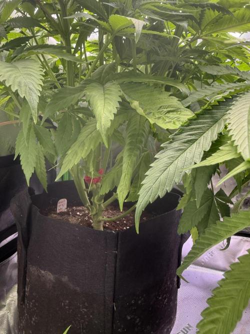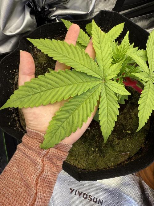 She's doing well for the most part. One leaf is showing some deficiency. I will be working on fixing this. Going to be flipping next week or two.