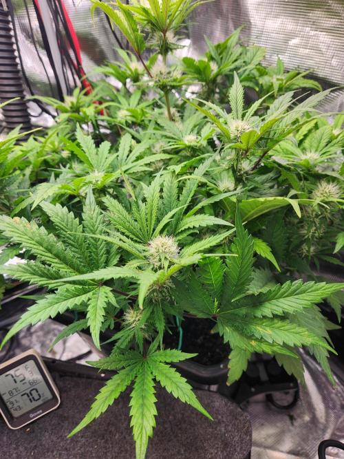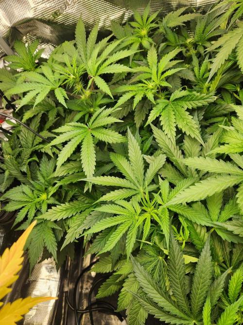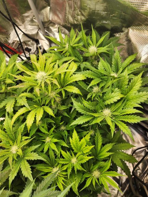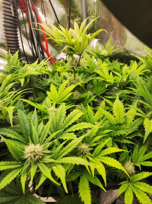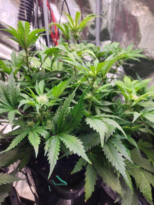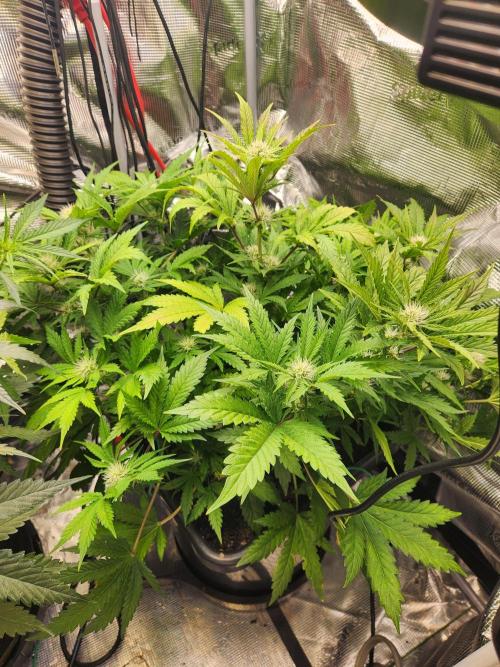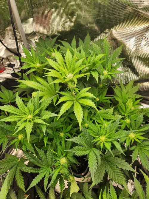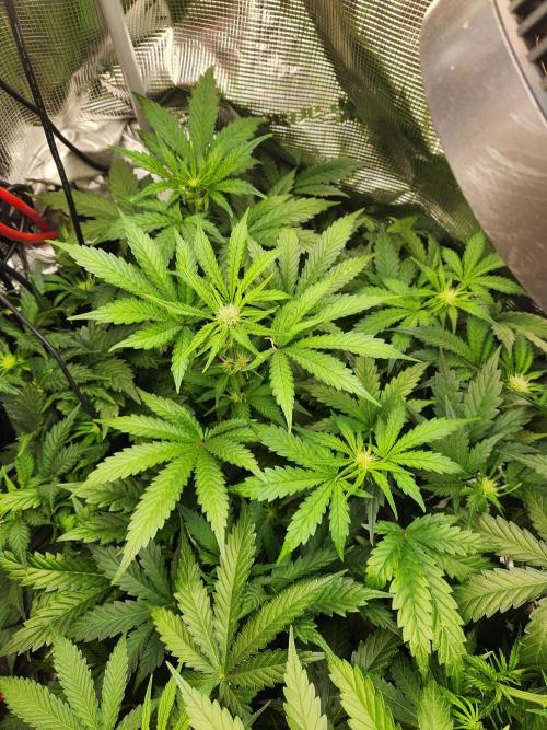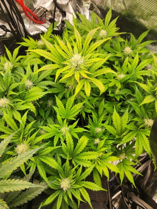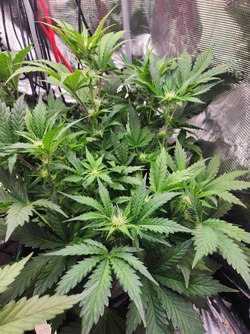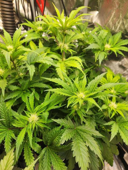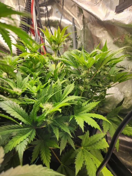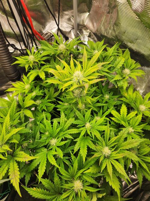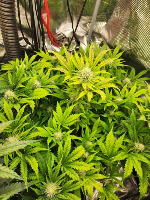 the middle cola sticks up a bit above the rest, and the rest are pretty short. the yellow is still present, but after plenty of foliar sprays, its either not Mg, or the leaves just arent gonna go back to green. i think its just an early fade. buds are starting to swell and look fine so im not too worried.