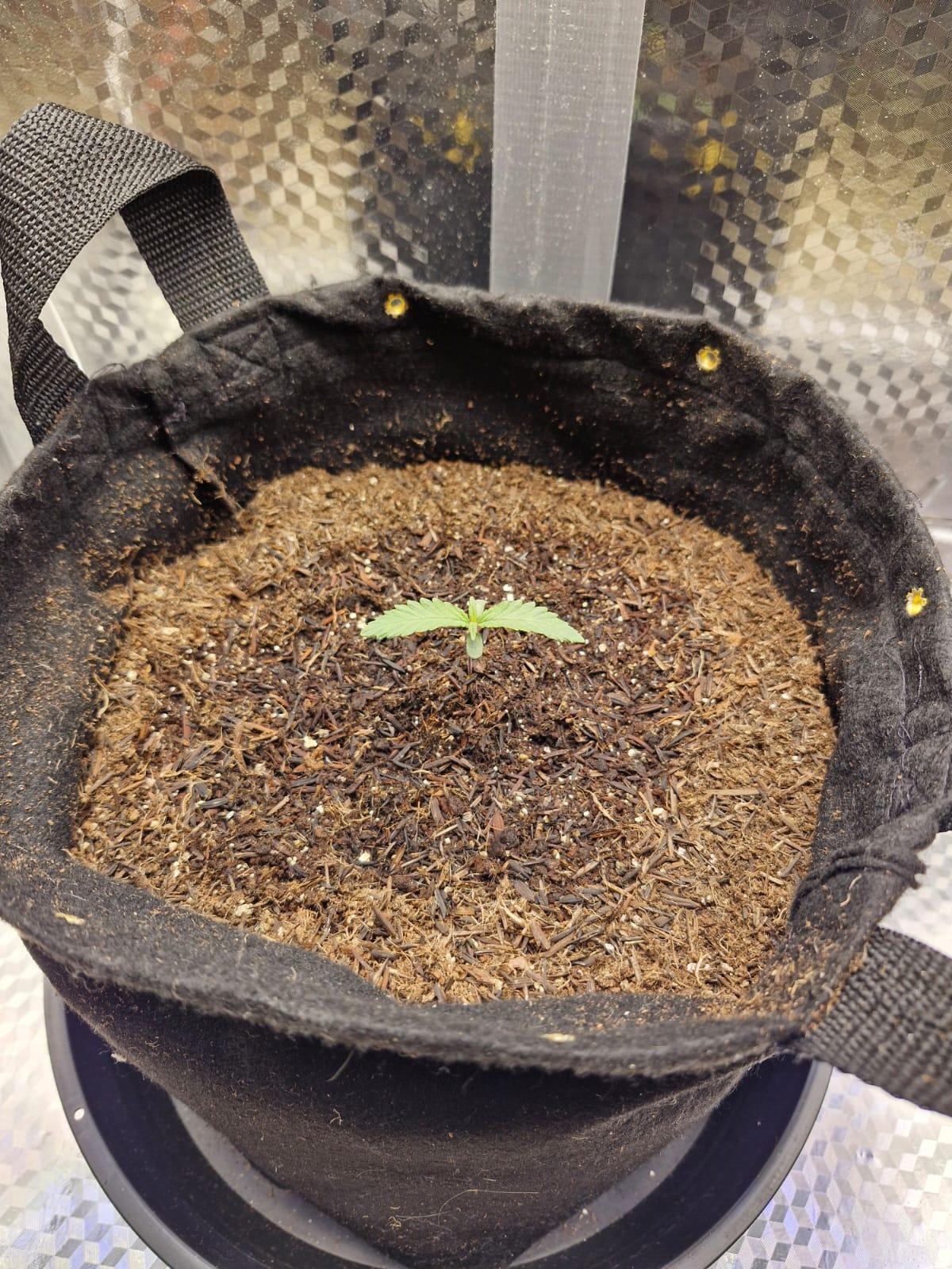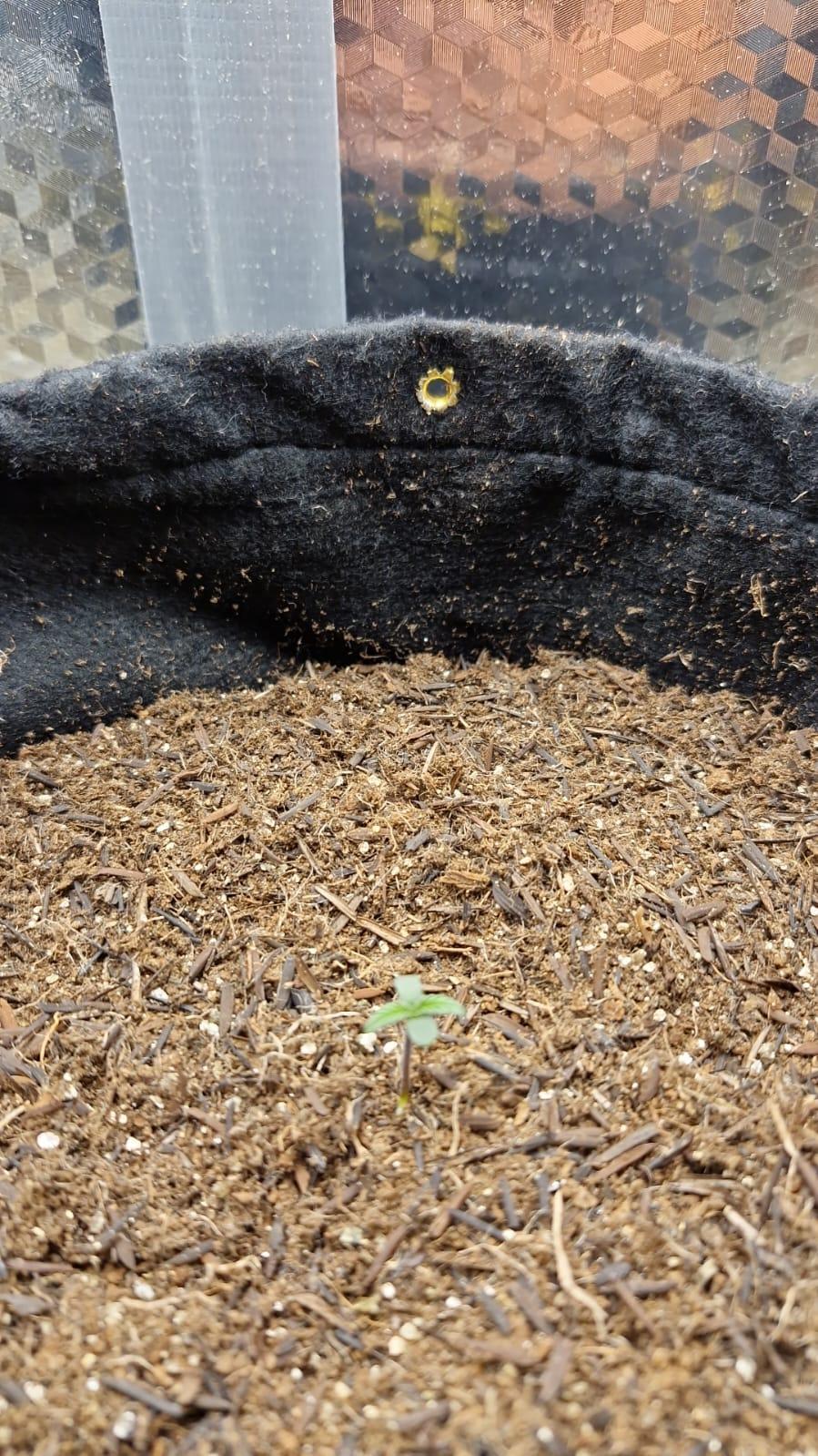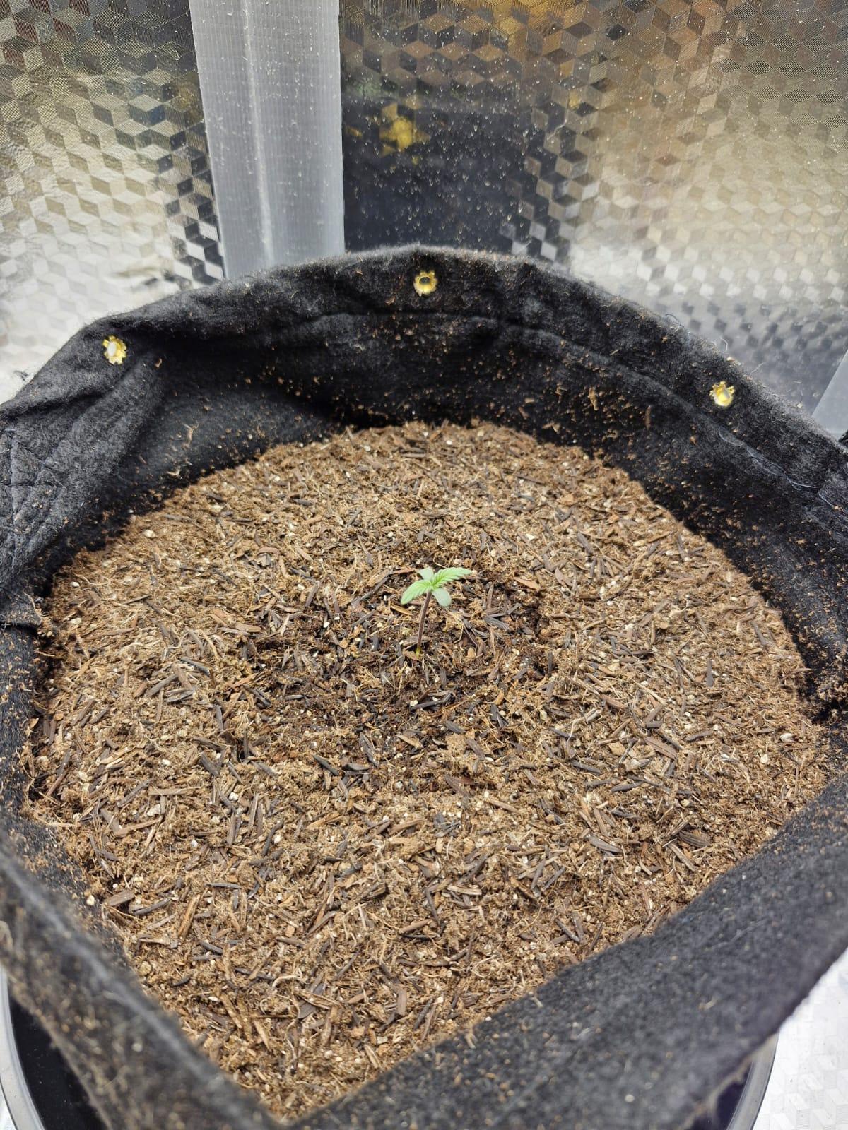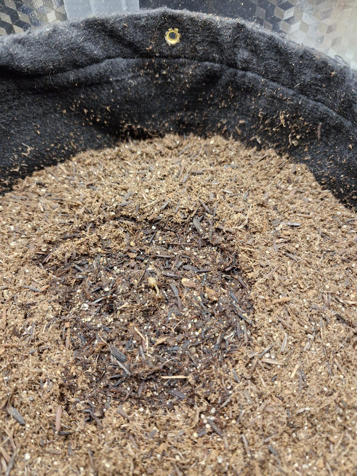 Seed didn't germinate entirely, but the first part was sarting to get out of the shell. Today I decided to plant it. using only California Soil, will further feed it with REMO Nutrients.