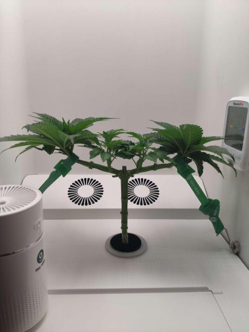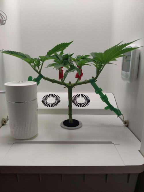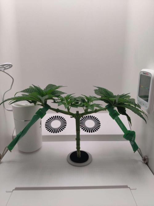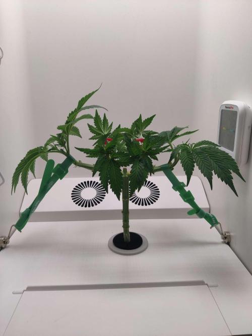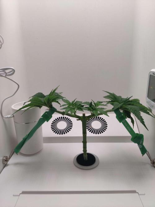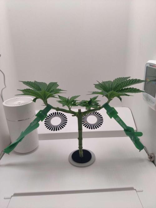 dabaglob Alright, we main-lining this perdy thing! Took the top and attempting to clone! CropSalt: Veg A - 11.5g CropSalt: Veg B - 7.75g CropSalt: RunClean - 5ml Southern AG: Garden Friendly Fungicide (99% Bacillus Amyloliquefaciens strain D747) - 5ml Reverse Osmosis Water: 2.5gal Day 2: I tied down the small mains (not pictured) Day 5: Chopped off the two large fan leaves