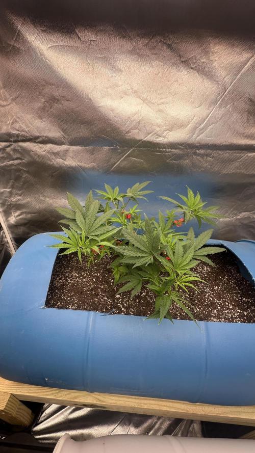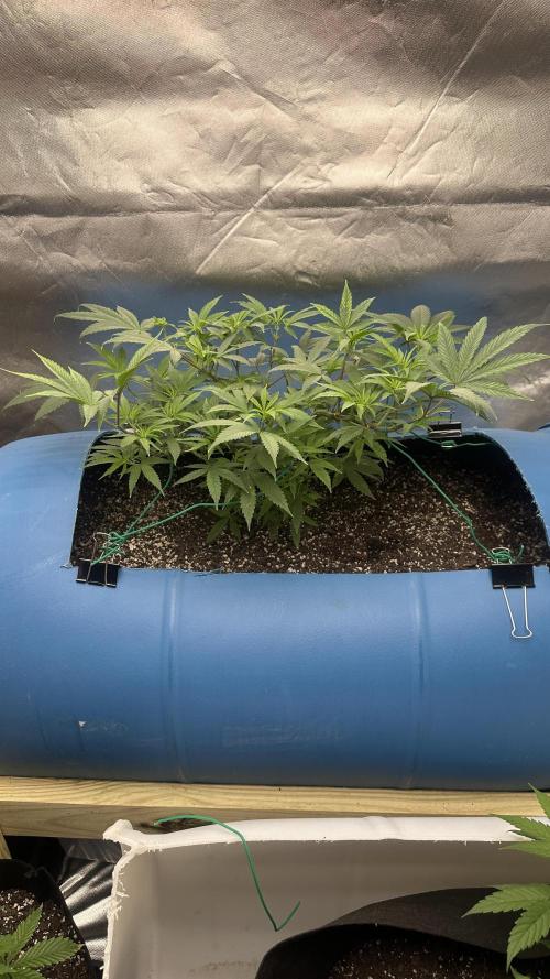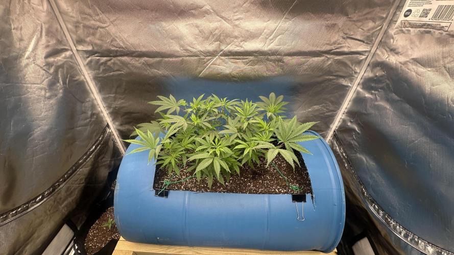DabMansGenetics Started it in seed starter soil and dropped the dissolvable small pot down into the barrel full of happy frog. Plan is to top and train the plant to fill up most of the tent with one plant. Hopefully I get a good purple pheno as well.
