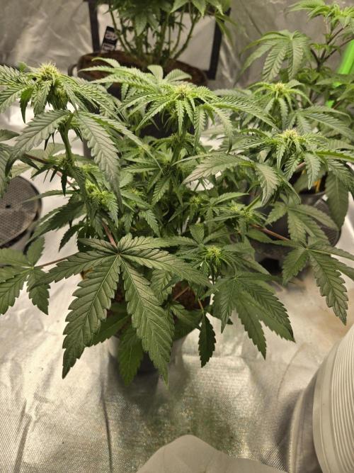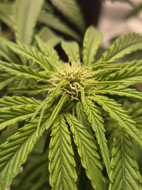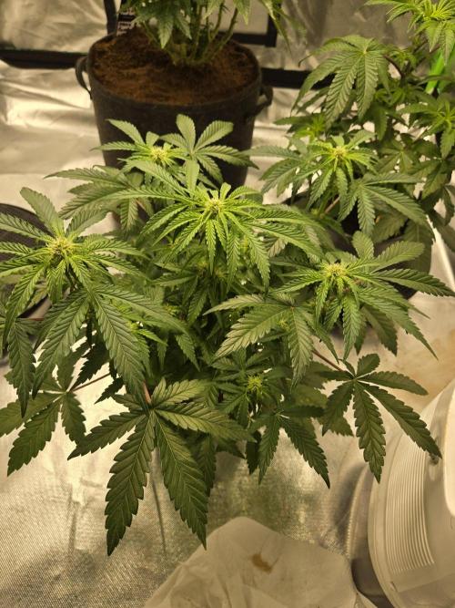 The canopy is developing rapidly, and the plant has adopted a dense, bushy form. The central stem is thick and sturdy, a sign of excellent early care and strong genetics. The leaves are huge—the classic fan leaves are wide and a deep, healthy green, indicating that it’s efficiently capturing light and is well-fed. Every node is tight and stacked, with new auxiliary branches shooting out quickly, ready to become major bud sites once flowering begins. This is exactly the kind of vigorous structure that i want