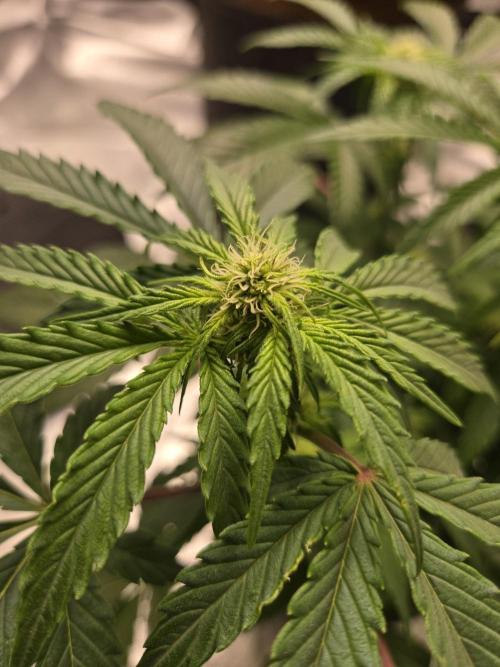 The plant has clearly entered the early flowering stage. This is evident from the presence of small, white, fluffy flower clusters (pre-flowers or pistils) developing at the node points and branch tips.