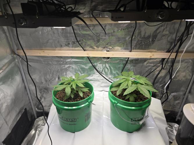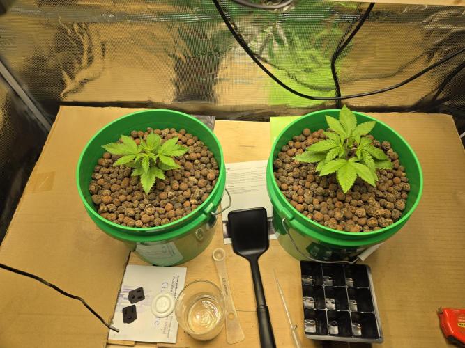 Topped after the fifth node, at the end of the week. Removed the bottom two nodes. The little one is definitely a different phenotype and not just a runt. Red stems on the leaves and some red on the stalks of both plants. Probably from the sodium bicarbonate toxicity. They could probably also use a higher EC. I don't think the salt has fully leeched, so I am not going to push it. They are growing well and should be ready for flowering a few days late at most.