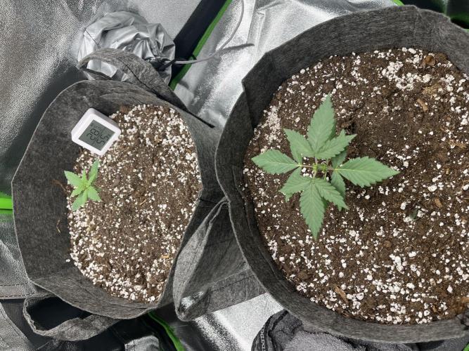 GoblinGrower Ok so 3rd week (for Gorilla, 2 and a half for Dwarf) was interesting. I tried to meet a more efficient VPD level by adjusting the humidity up to 70% so i got i new humidifier that has really helped, i wish i did it sooner. The humidity is kind of high for the bigger plant but it's balanced back by the high temperatures, so the plant will not transpire as much. Furthermore, in order to try to reduce the heat in the box i introduced a second fan poiting at the LED light. I also introduced BioHeaven and I really think it has made the difference. I'm trying to use it every time with CalMag and I alternate BioGrow every other watering. I noticed a slight decoloration of the intra-venus parts of the leaves in the dwarf, so I'll give some extra CalMag and see if in a few days it's going to be better.