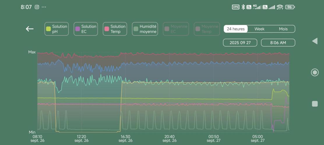 Notes sur les données : PPFD bas en "Dim" car cycles lumière éteints ; focus sur Mon/Nuit pour les moyennes actives. Graphs 24h confirment : Temp stable entre 22-24.5°C, Humidité 58-74%, VPD ~0.7-1.0 kPa, sans outage.Défis et AjustementspH instable résolu : Les 2 premières semaines, je corrigeais tous les jours (oscillations 5.8-6.5 dues à l'hydro neuf). Cette semaine, boom – stable à 6.07 grâce aux stabilisateurs Aptus et monitoring Trolmaster. Victoire !