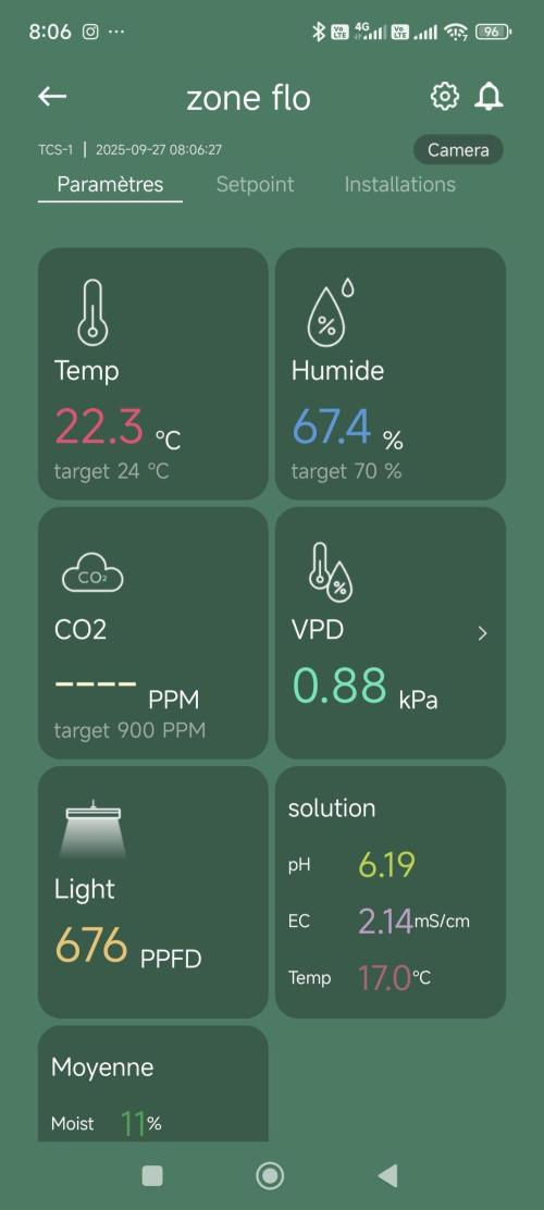 - **Éclairage** : PPFD à 676, ce qui est confortable pour la veg, mais je sens un potentiel pour une augmentation progressive.