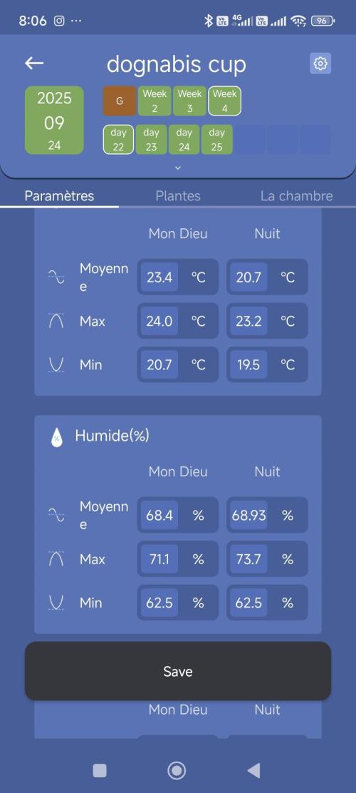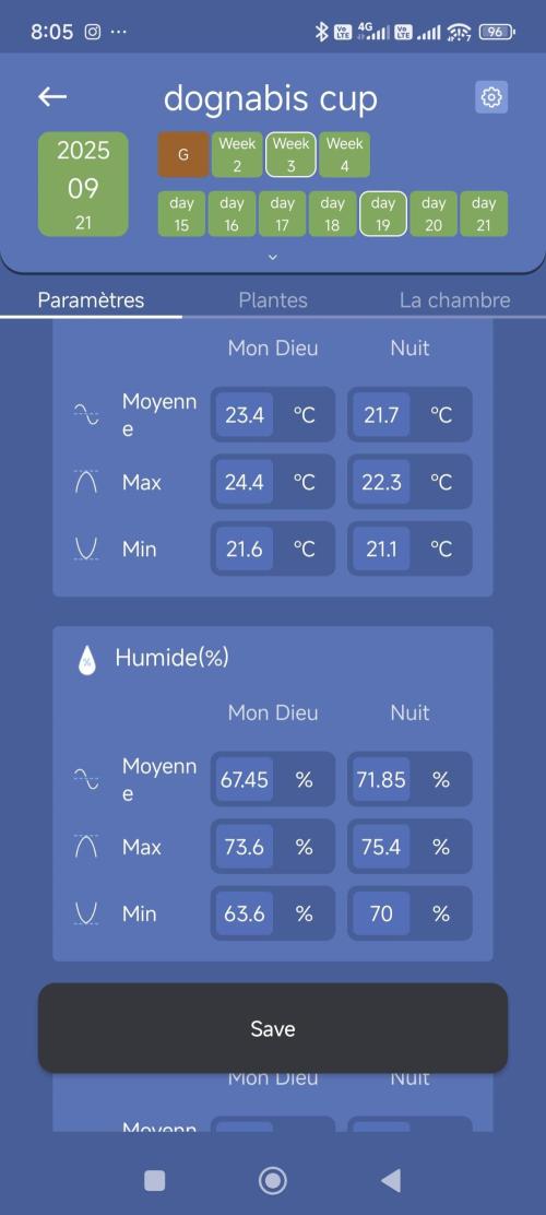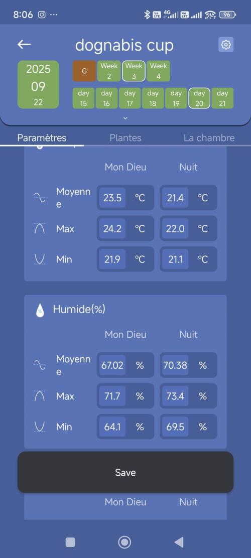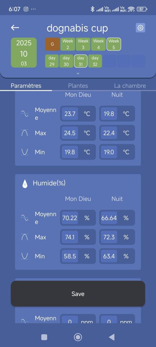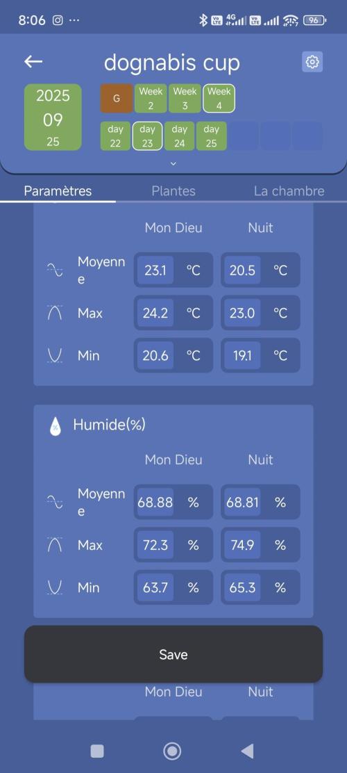 Objectif global : Maximiser la structure buissonnante pour la floraison future, en visant des monstres... mais adaptation forcée au switch précoce ! Salut la team DogDoctor et la communauté Dognabis Cup ! Voici le récap de ma semaine 3 en végé pour ma Zamnesia Permanent Marker. Cette strain est une bête : elle pousse vite, dense et résineuse, mais comme vous le verrez, je dois déjà anticiper un switch en 12/12 plus tôt que prévu à cause de mes autres plantes en avance (qui stressent pour du temps extra en végé). Pas de monstres XXL cette fois, mais on optimise ce qu'on peut avec du LST/FIM et une gestion fine de l'hydro. Nutrition Aptus qui cartonne, et enfin, le pH s'est stabilisé après des débuts chaotiques – plus de corrections quotidiennes, ouf ! État des PlantesLes bébés Permanent Marker sont en pleine explosion : tiges solides, feuilles larges et dark green, avec une bonne ramification grâce au LST et FIM appliqués cette semaine. J'ai plié et attaché les tops pour une canopée uniforme (environ 4-5 nœuds principaux par plante), et topping sur les plus vigoureuses pour booster les côtés. Croissance verticale contrôlée à ~15-20 cm de hauteur moyenne, mais la densité racinaire est top dans les billes d'argile – pas de signes de stress oxygène. Malheureusement, les autres plantes du run (pas en concours) sont déjà en train de s'étirer et demandent du 12/12 ; je vais devoir les stresser (légèrement réduire les nutriments ou eau) pour grappiller 3-5 jours de végé extra ici. Objectif : ne pas dépasser 4 semaines total en végé pour synchroniser le tout. Pas l'idéal pour des colosses, mais la qualité prime pour la Cup ! Environnement et ContrôlesTout est verrouillé via Trolmaster : température stable autour de 24°C (cible), humidité à 70% (parfait pour la végé), CO2 à 900 PPM (maintien manuel pour booster la photosynthèse). VPD optimal à ~0.9 kPa, ce qui colle pile aux recos Aptus pour éviter transpiration excessive. Lumière augmentée de 10 PPFD comme prévu (maintenant à ~679 PPFD moyen en zone flo), et les graphs montrent une belle stabilité – pas de pics chaotiques. Pour l'hydro : marées réduites de 2 min (maintenant ~15-20 min par cycle) et 2 cycles en moins par jour (de 8 à 6), pour durcir les racines sans noyade. Solution à EC 2.2 (up de 0.2 cette semaine pour suivre la faim végé), pH enfin stable à 6.07 (après des ajustements quotidiens les 2 premières semaines – merci les tampons Aptus !). EC solution à 2.16 mS/cm, temp eau à 17.9°C (refroidisseur au top). Mousture moyenne à 90% – bien drainé, zéro anaérobie. Données Récapitulatives de la SemaineVoici un tableau synthétique des stats clés (moyennes sur Mon/Dim/Nuit pour les zones "Plantes" et "Chambre", basées sur les logs app). Tout est cohérent avec les graphs 24h qui montrent des courbes lisses, sans dérive majeure.Paramètre