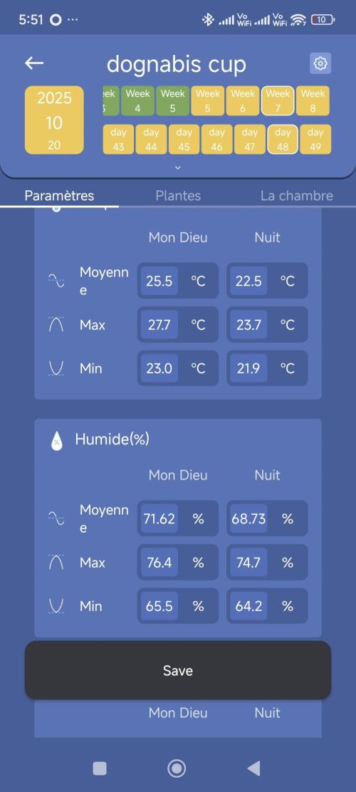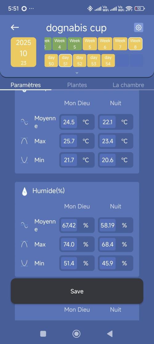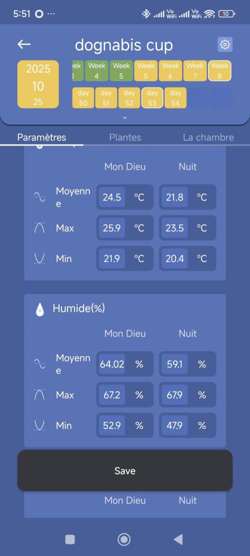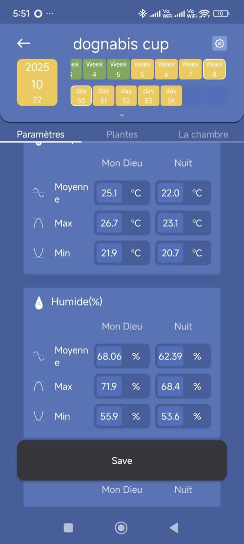 Températures (Plants vs Chambre) : Moyennes stables à 24-25°C jour (plants) / 21-22°C nuit, avec max/min bien encadrés (26-28°C max jour, 20-22°C min nuit). Chambre légèrement plus fraîche la nuit (20-21°C), idéal pour accumuler les résines sans stress thermique. Légère hausse observée en fin de semaine, ajustée via ventilation.