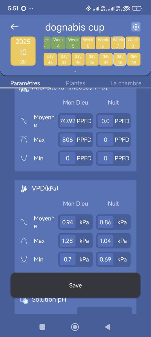 VPD : Maintenu à 0,94-1,04 kPa jour / 0,86-1,04 kPa nuit, calculé via Trollmaster – spot on pour cette phase, boostant l'uptake de Ca et Mg sans transpiration excessive.