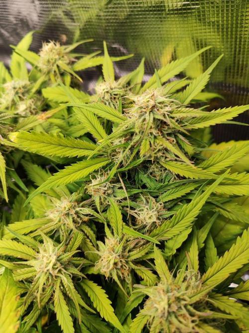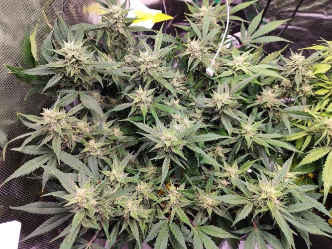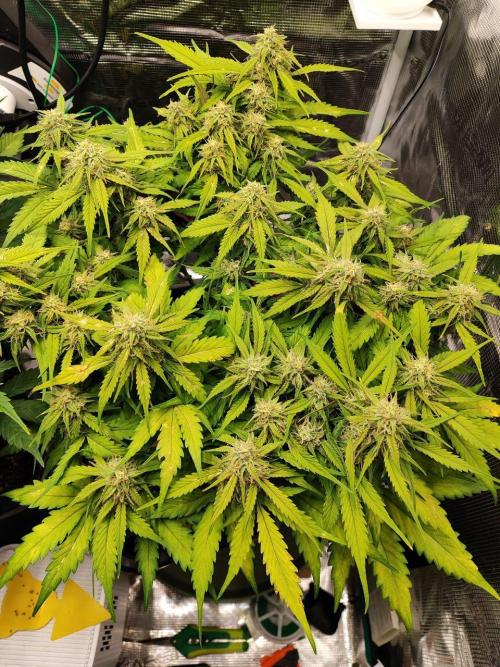 Day 58: Removed all ties and benders and adjusted the light height to reduce the PAR a bit. No water today. Removed a few yellow leaves off Cindy. Buds are stacking nicely.