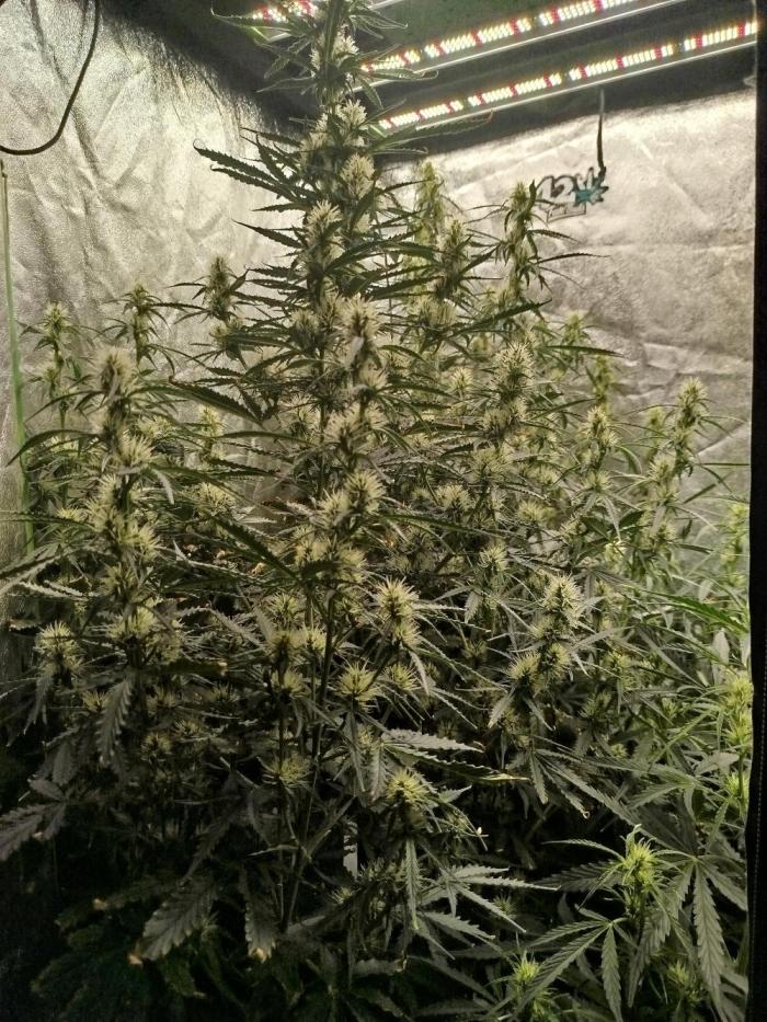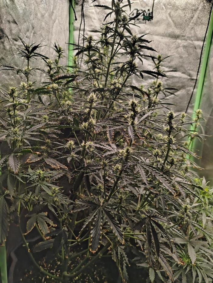 KingOfQueens Getting a bit bit of a mess now raised the 2 smaller plants to try and get a more even canopy, first signs of flowering, still not got a fan really needing to pick one up had molding before at flowering stage