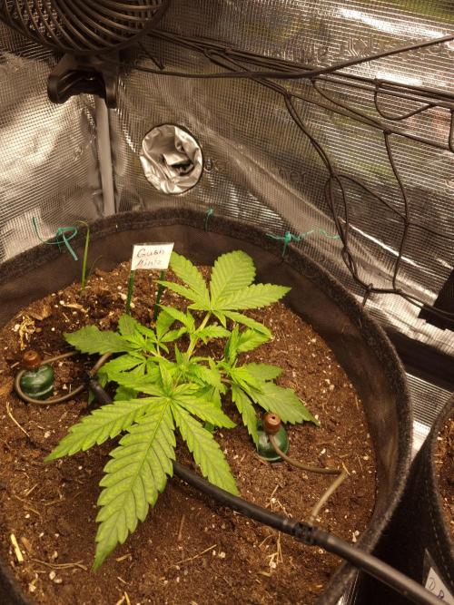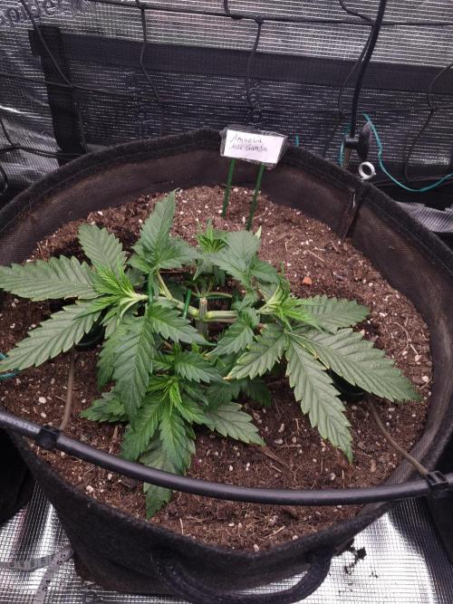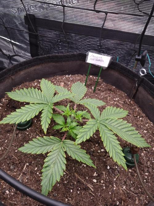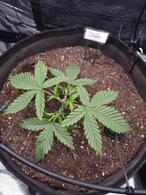 Amnesia Mac Ganja (AMG) → Höhe: 14 cm → Wuchs: schlank, sativa-typisch → leicht gestreckt, stabiler Stängel → untere Blattpaare leicht ausgewaschen (vermutlich pH-Schwankung durch häufiges Sprühen)