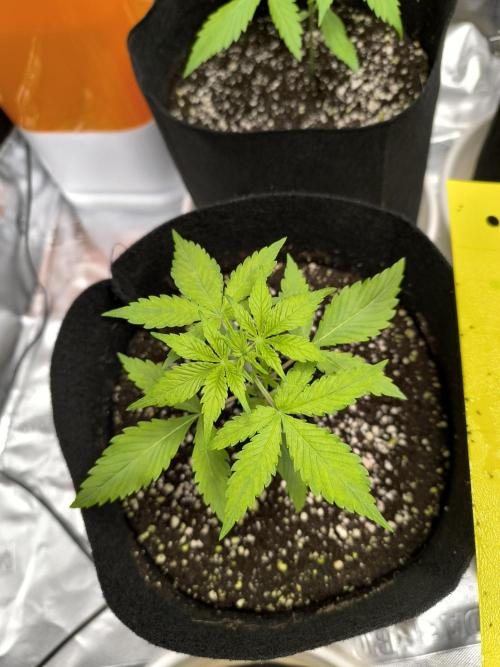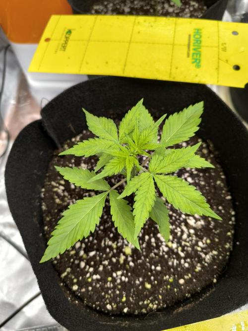 09/17: Watered twice, total 150 ml at pH 5.7, EC 650. Second set of leaves starting to show 🌱. Noticed small bugs, likely fungus gnats from the coco. Placed yellow sticky traps and will wait longer before next watering to let the coco dry out.