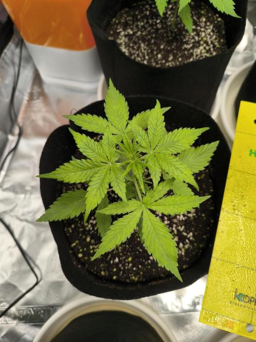 09/29: Watered again but with 500ml this time. Solution (same recipe as yesterday) at pH 5.6. Surprisingly, runoff pH rose higher than yesterday, now at 7.0, with EC 700. Light intensity increased to 14.5k lux.