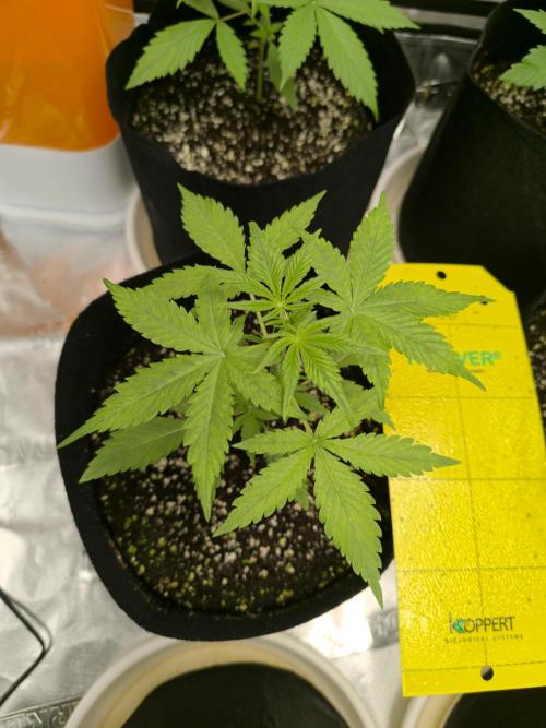 10/01: Watered with 1 L at pH 5.6, EC 1200. Solution included 2.5 ml/L CalMag + 1 ml/L Coco A + 1 ml/L Coco B + 1 ml/L Deeper Underground. Runoff measured EC 650, pH 7.0. Substrate pH still not dropping, but plants are growing at a good pace. Only two plants continue to show chlorosis, while all show a noticeable thickening of stems this week.