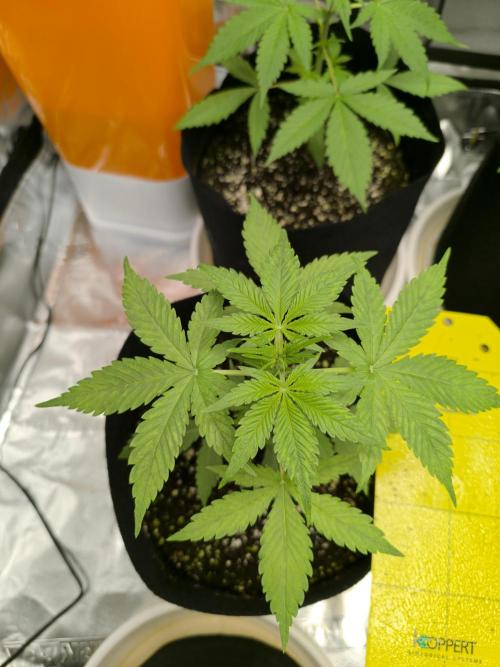09/27: Started the day noticing chlorosis on some leaves. The pattern matches an iron deficiency: interveinal chlorosis mainly on the newer leaves. After checking, this seems to be caused by a nutrient lockout, consistent with the high substrate pH since the beginning of the grow. Lesson learned for next time. Performed a heavy flush with 20 L of water per plant. Runoff dropped from EC 1200 → 500 and pH 7.1 → 6.7. From now on, I’ll water with enough solution to get ~20% runoff each time instead of just ~250 ml. Will also lower input pH to 5.6–5.7 to gradually bring substrate pH down into range. Noticed that some plants have started to give off a light smell 🌿.
