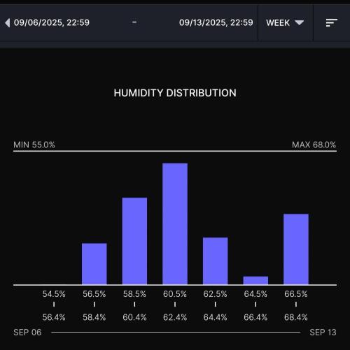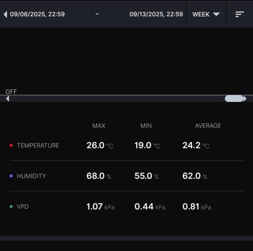 Hashy ******************************************** Week 1 Early veg ******************************************** Light cycle=18/6 Light Power=68w 28% Extractor controller settings (during lights on). High temp= 26c High Rh= 70% Speed max=9 Speed min=1 Extractor controller settings (during lights off). High temp= 24c High Rh= 68% Speed max=9 Speed min=1 Smart controller settings (during lights on). Lights on=5.00am Camera on=5.05am Smart controller settings (during lights off). Lights off=11.00pm Camera off=10.55pm VPD aim=0.4-0.9 DLI aim=16-22 EC aim=0.2-0.8 PH aim=6.0-6.5 💧💧💧💧💧💧💧💧💧💧💧💧💧💧💧💧 Method= manually Feed=Seedling Nutes Neutralise=0.1ml/L Roots=5ml/L Easy Ph down=0ml/L (1ml=24 drops, 1 drop=0.04ml) Easy Ph Up=0ml/L (1ml=24 drops, each drop is 0.04ml) Ec=0.3 PH=6.3/6.4 💧💧💧💧💧💧💧💧💧💧💧💧💧💧💧💧 ******************************************** ******************************************** 📅7/9/25 Sun (Day 1) 📋 📅8/9/25 Mon (Day 2) 📋Support plant 💧0.25L Ec=0.3 PH=6.3 📅9/9/25 Tue (Day 3) 📋 📅10/9/25 Wed (Day 4) 📋raise light a few CM. Top up pot with soil. 💧0.5L Ec=0.3 PH=6.3 📅11/9/25 Thur (Day 5) 📋 📅12/9/25 Fri (Day 6) 📋💧0.75L Ec=0.3 PH=6.3 📅13/9/25 Sat (Day 7) 📋H=4cm, D=43cm, Dli=16.3 18hr ******************************************** Weekly roundup. 📋 Her 1st week is over and she's exactly were I'd expect her to be at in development. Having issues with the new camera. Take it easy. Back soon. ********************************************