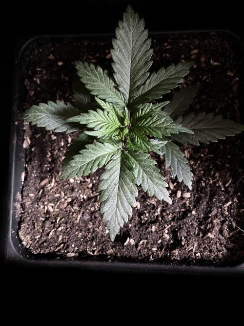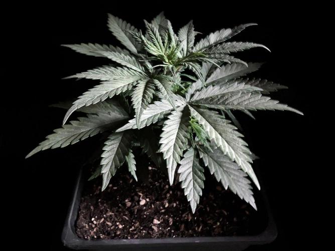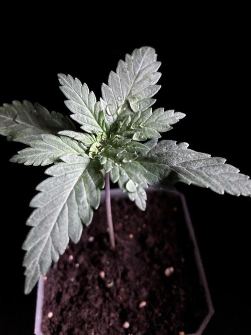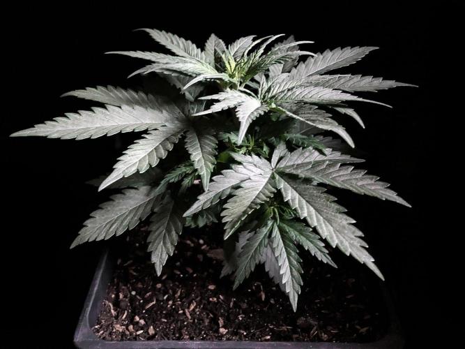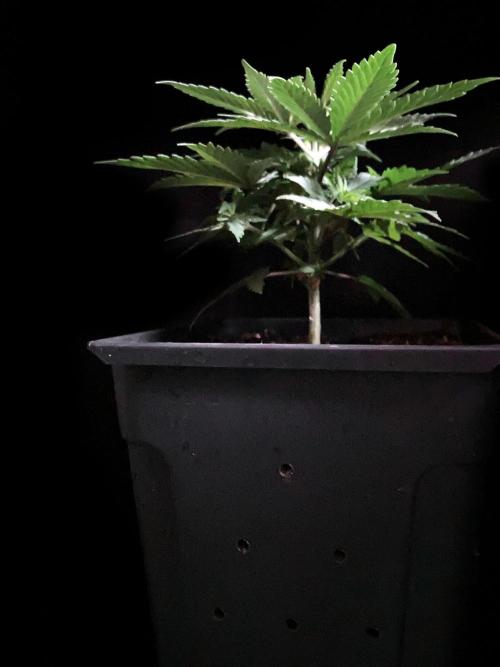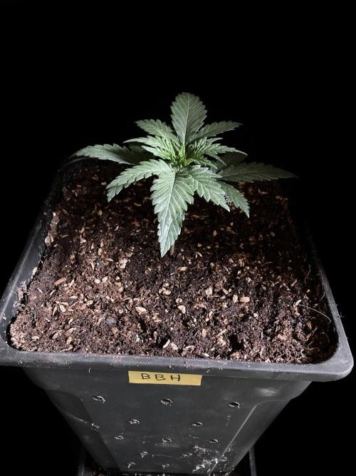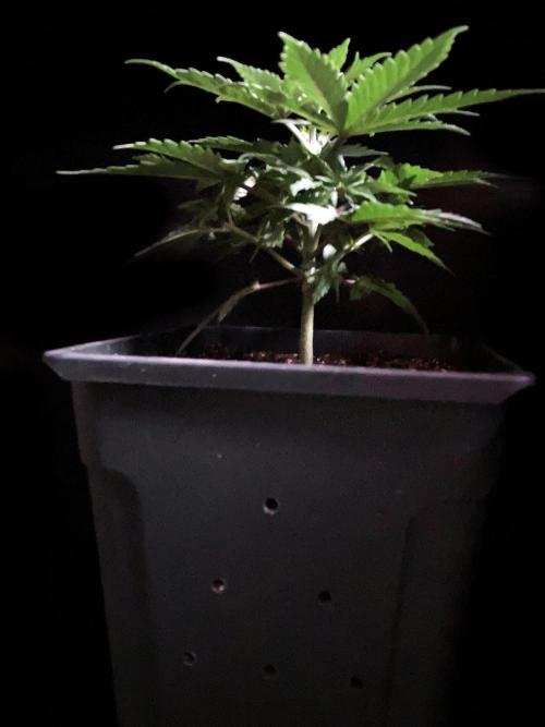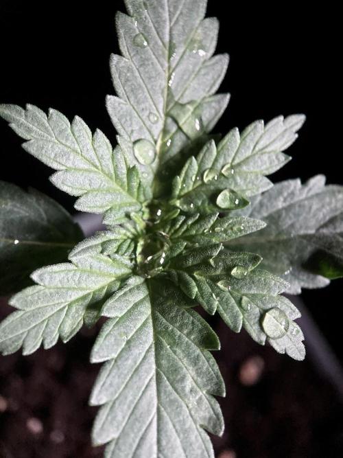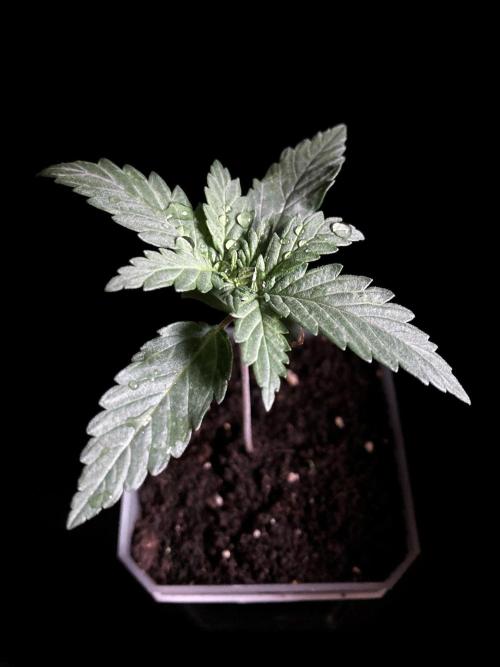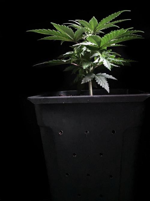 De momento la alumbro durante 21 horas y la riego exclusivamente con agua de manantial, melaza y Microorganismos de Montaña Activados de forma líquida y un poco de Humato de leonardita (ácidos húmicos), de esta manera inoculo masivamente microbiología y favorezco el ecosistema microbiano, para que solubilice los nutrientes y minerales del sustrato, al tiempo y de momento, no fuerzo a la planta a alimentarse con Bio Nutrientes solubles, y de esta manera también facilito la expansión de las raíces por la maceta. Cultivar sin molestar, ese es el objetivo, para que las plantas demuestren desde jóvenes hasta donde pueden llegar.
