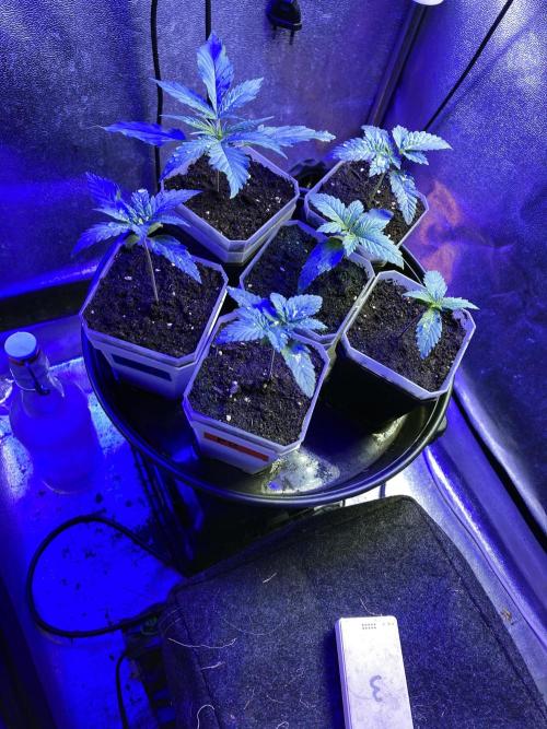 Esta semilla ha sido la primera en germinar, en apenas 12 horas, a continuación la pasé a una pequeña maceta con un sustrato basado en turbas con un poco de humus de lombriz y humedecido con agua de manantial y Microorganismos de Montaña Activados (MMA) de forma líquida. A los cuatro días de vida comencé a darle 24 horas de luz a esta y las otras plántulas, de momento estoy usando dos paneles LED de 35w, uno con luz azul (450nm) el otro con luz blanca (7700K)... a jugar!