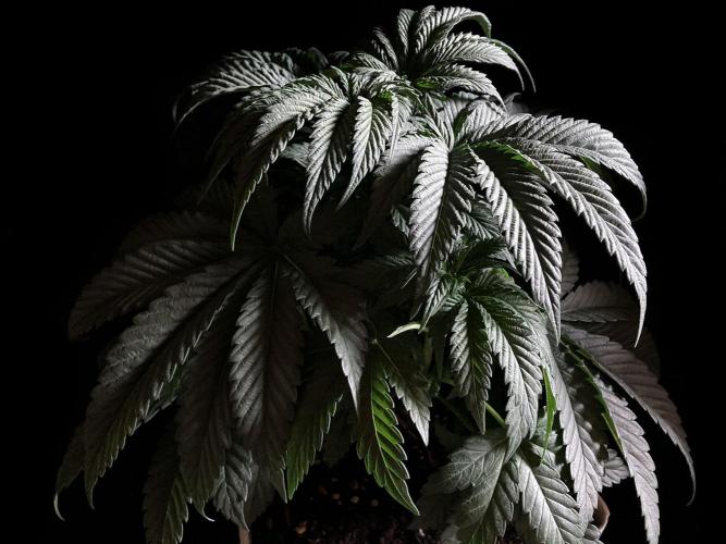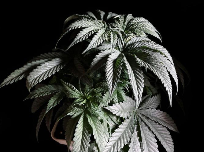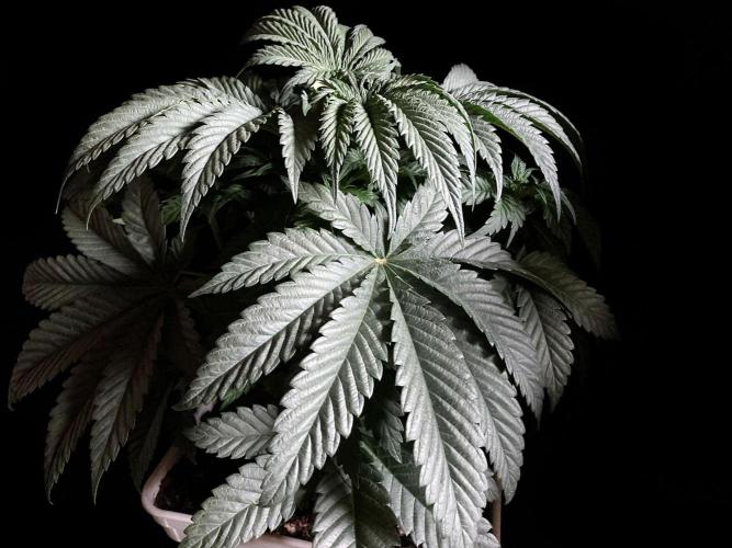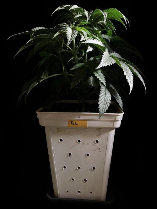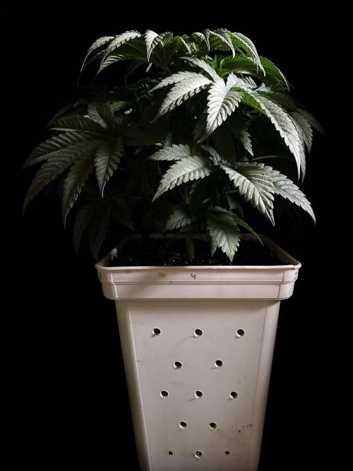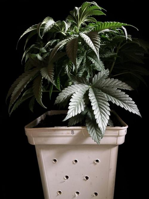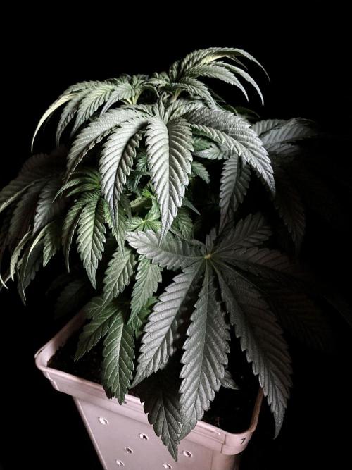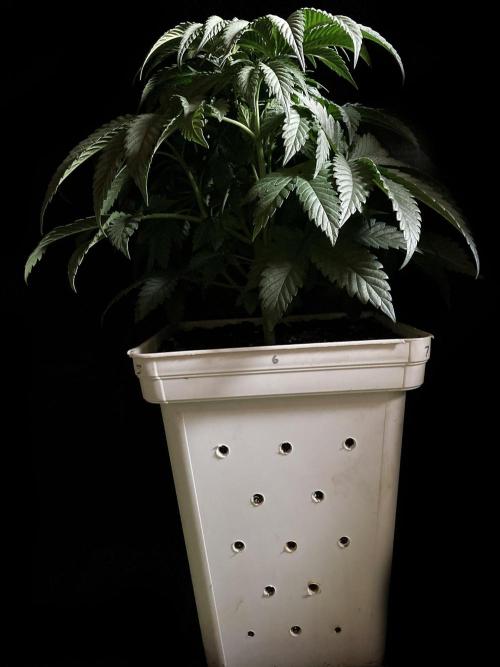De momento la alumbro durante 21 horas y la riego exclusivamente con agua de manantial, melaza y Microorganismos de Montaña Activados de forma líquida y un poco de Humato de leonardita (ácidos húmicos), de esta manera inoculo masivamente microbiología y favorezco el ecosistema microbiano, para que solubilice los nutrientes y minerales del sustrato, al tiempo y de momento, no fuerzo a la planta a alimentarse con Bio Nutrientes solubles, y de esta manera también facilito la expansión de las raíces por la maceta. Cultivar sin molestar, ese es el objetivo, para que las plantas demuestren desde jóvenes hasta donde pueden llegar.