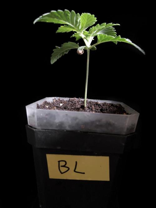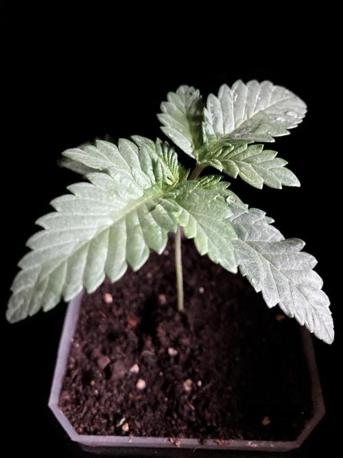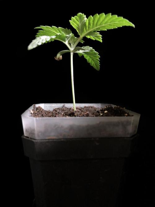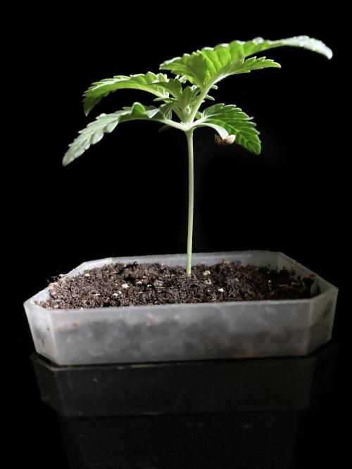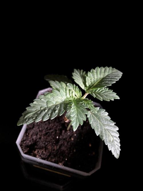 Esta semilla ha germinado en 24 horas, a continuación la pasé a una pequeña maceta con un sustrato basado en turbas con un poco de humus de lombriz y humedecido con agua de manantial y Microorganismos de Montaña Activados (MMA) de forma líquida. A los cuatro días de vida comencé a darle 24 horas de luz a esta y las otras plántulas, de momento estoy usando dos paneles LED de 35w, uno con luz azul (450nm) el otro con luz blanca (7700K)... a jugar!