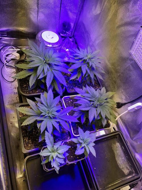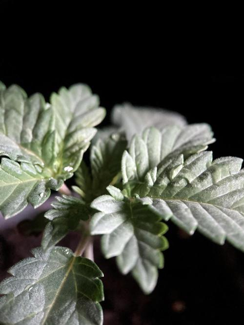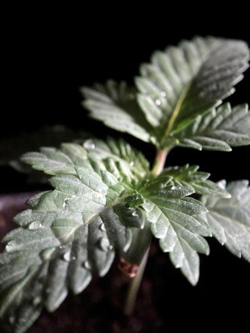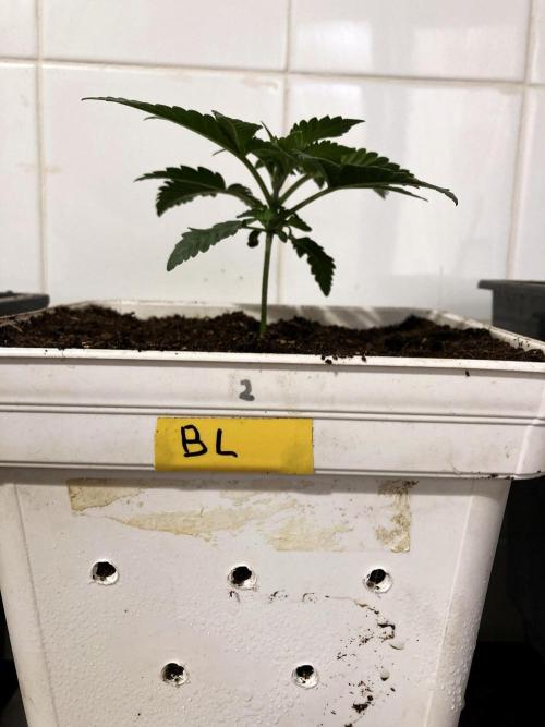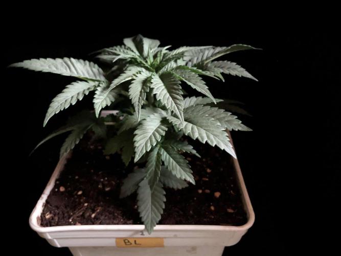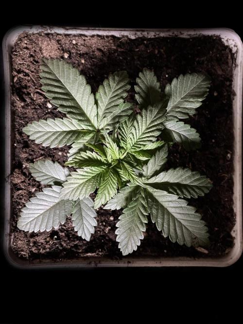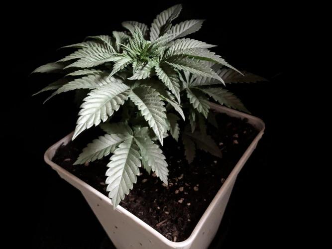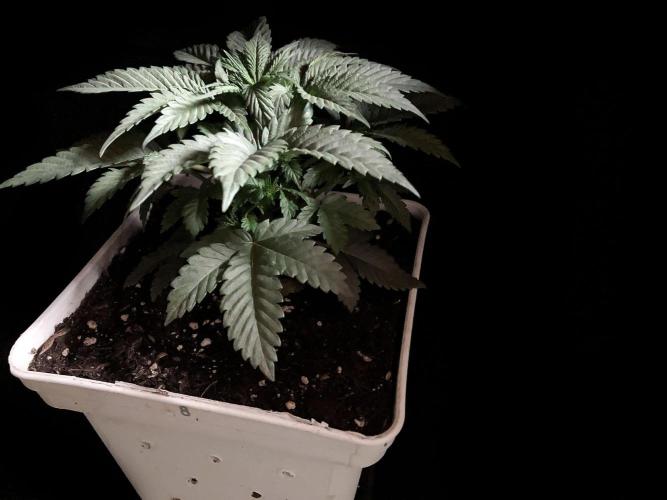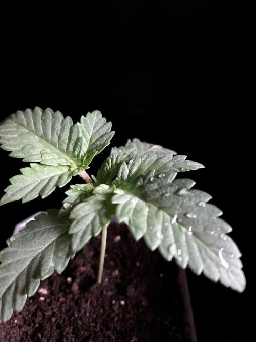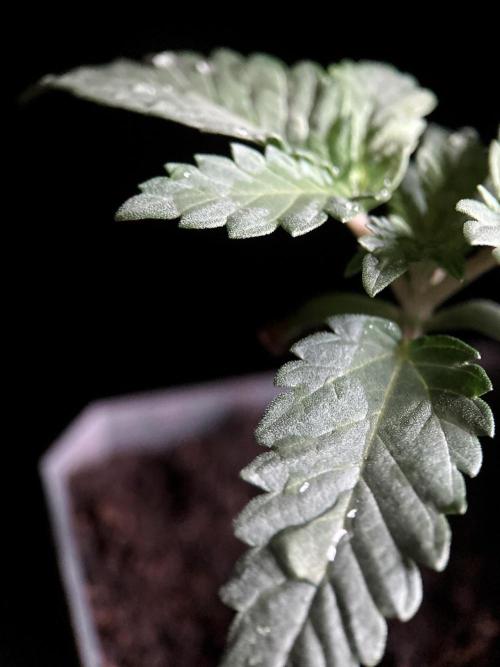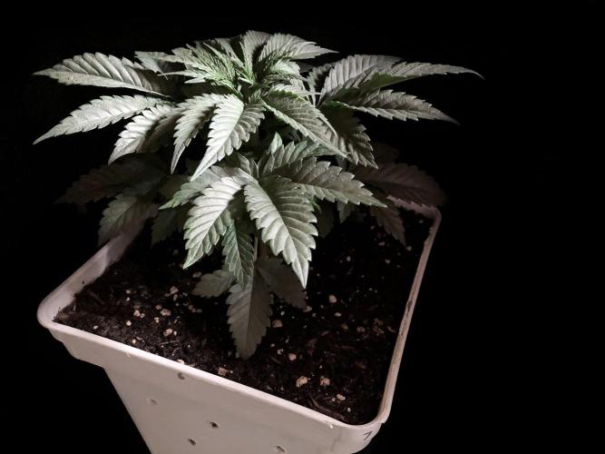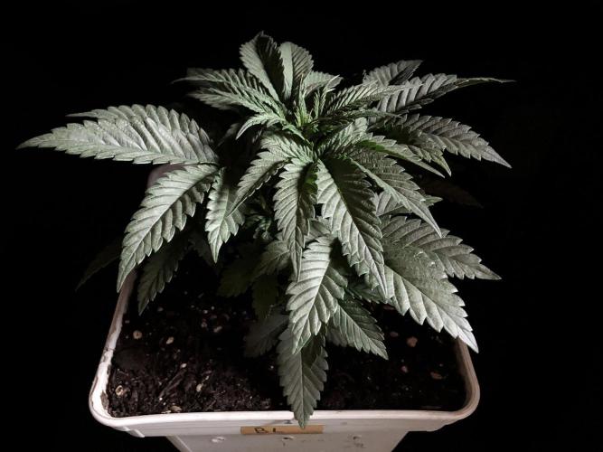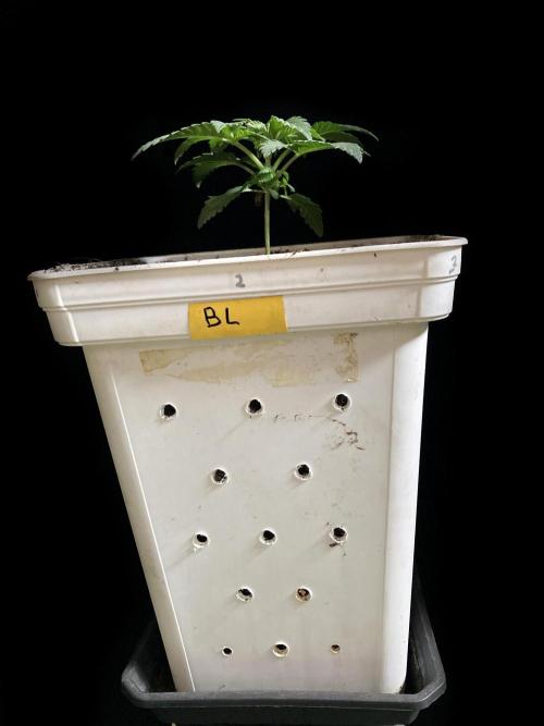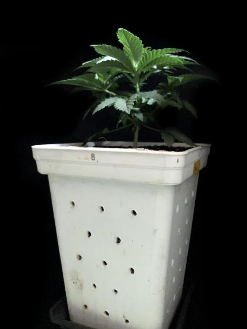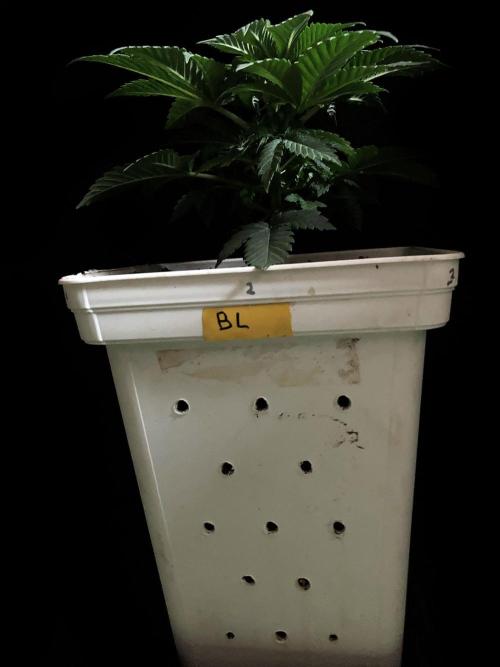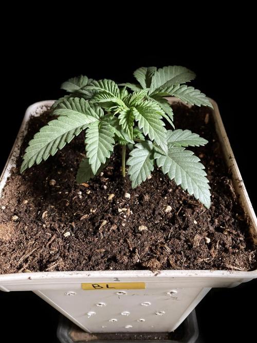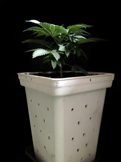 De momento la alumbro durante 21 horas y la riego exclusivamente con agua de manantial, melaza y Microorganismos de Montaña Activados de forma líquida y un poco de Humato de leonardita (ácidos húmicos), de esta manera inoculo masivamente microbiología y favorezco el ecosistema microbiano, para que solubilice los nutrientes y minerales del sustrato, al tiempo y de momento, no fuerzo a la planta a alimentarse con Bio Nutrientes solubles, y de esta manera también facilito la expansión de las raíces por la maceta. Cultivar sin molestar, ese es el objetivo, para que las plantas demuestren desde jóvenes hasta donde pueden llegar.