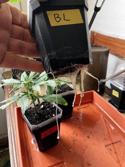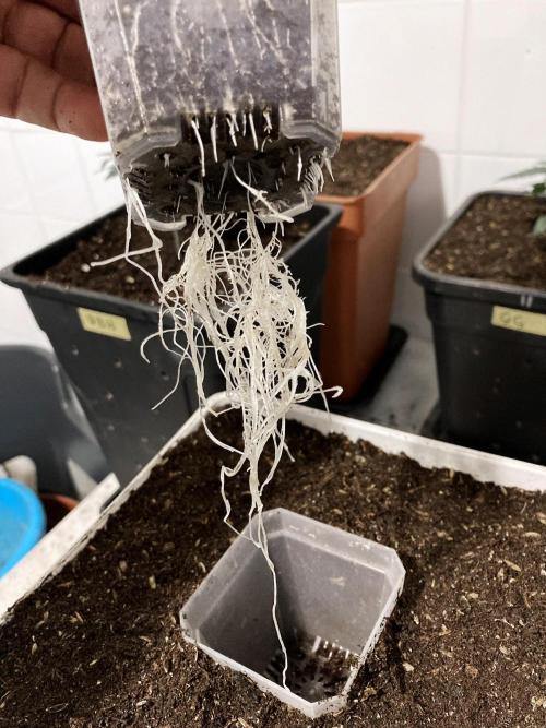 Ayer hice el trasplante a la maceta final, el desarrollo de las raíces saliendo impetuosas por la base es espectacular... comienza el gran juego!😁